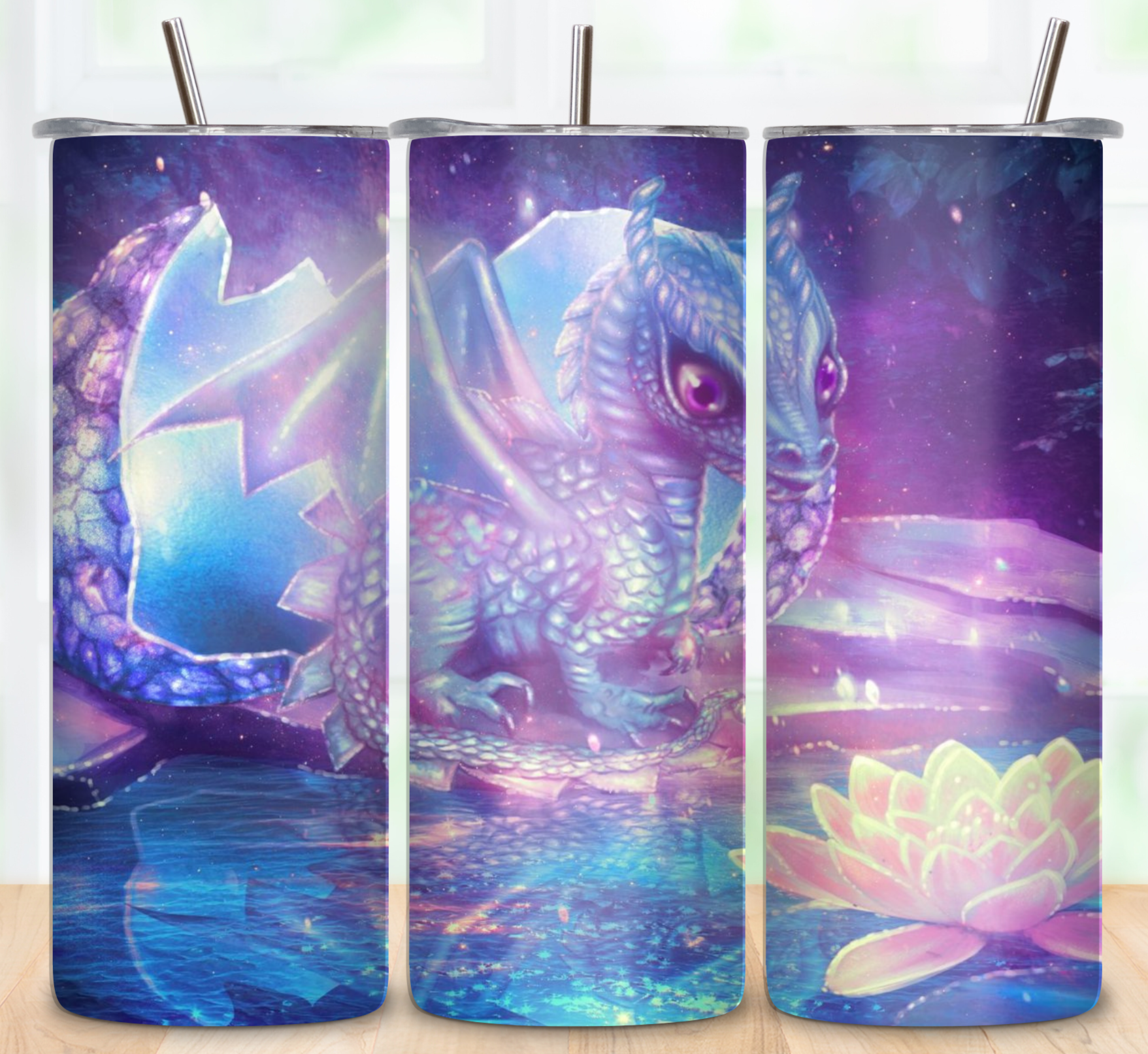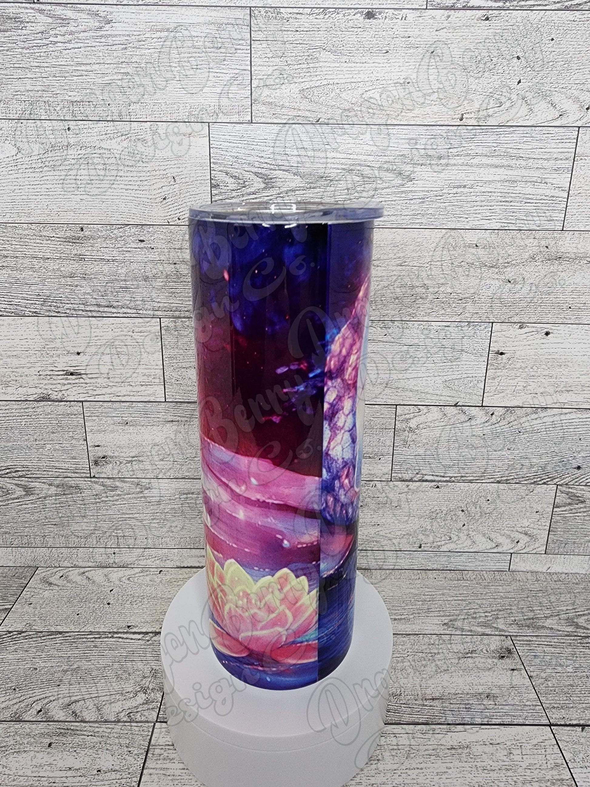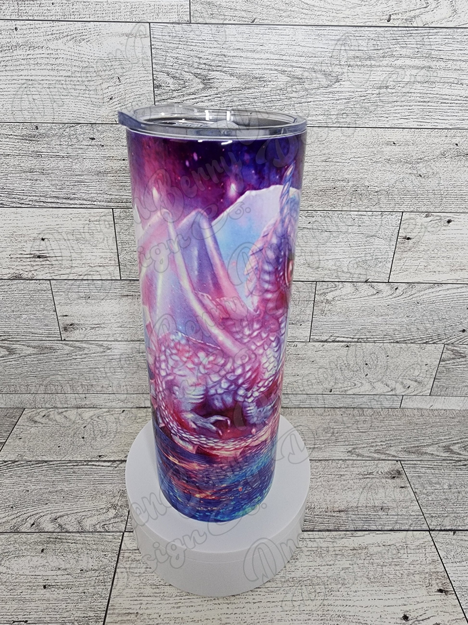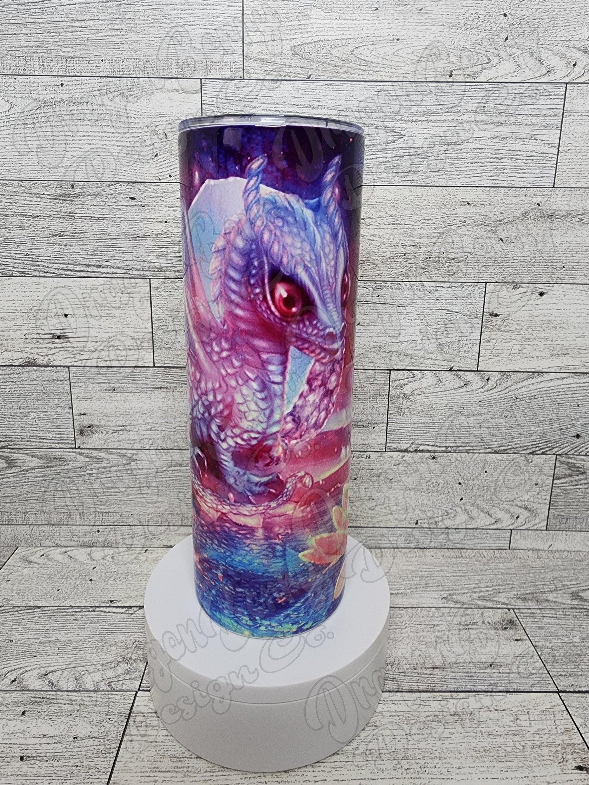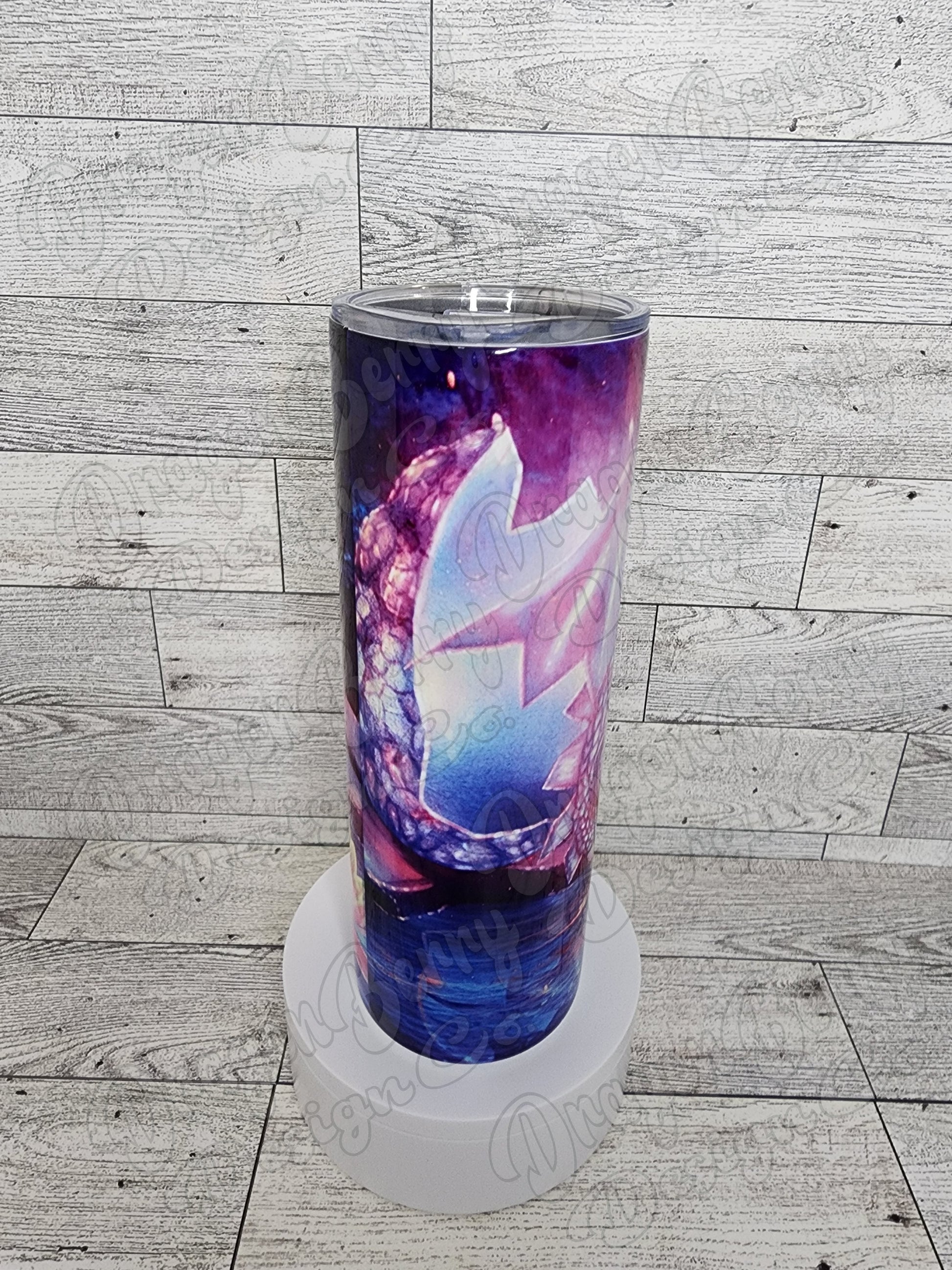 20oz sublimation tumbler with a baby dragon design. Comes with a lid and straw. Double wall vacuum insulated cup design.
