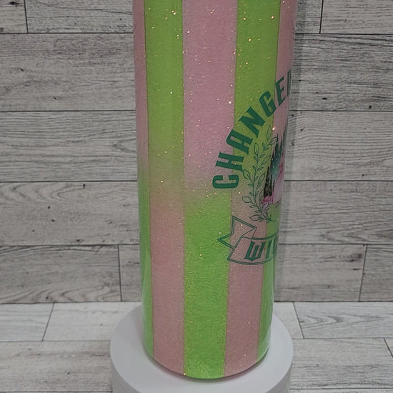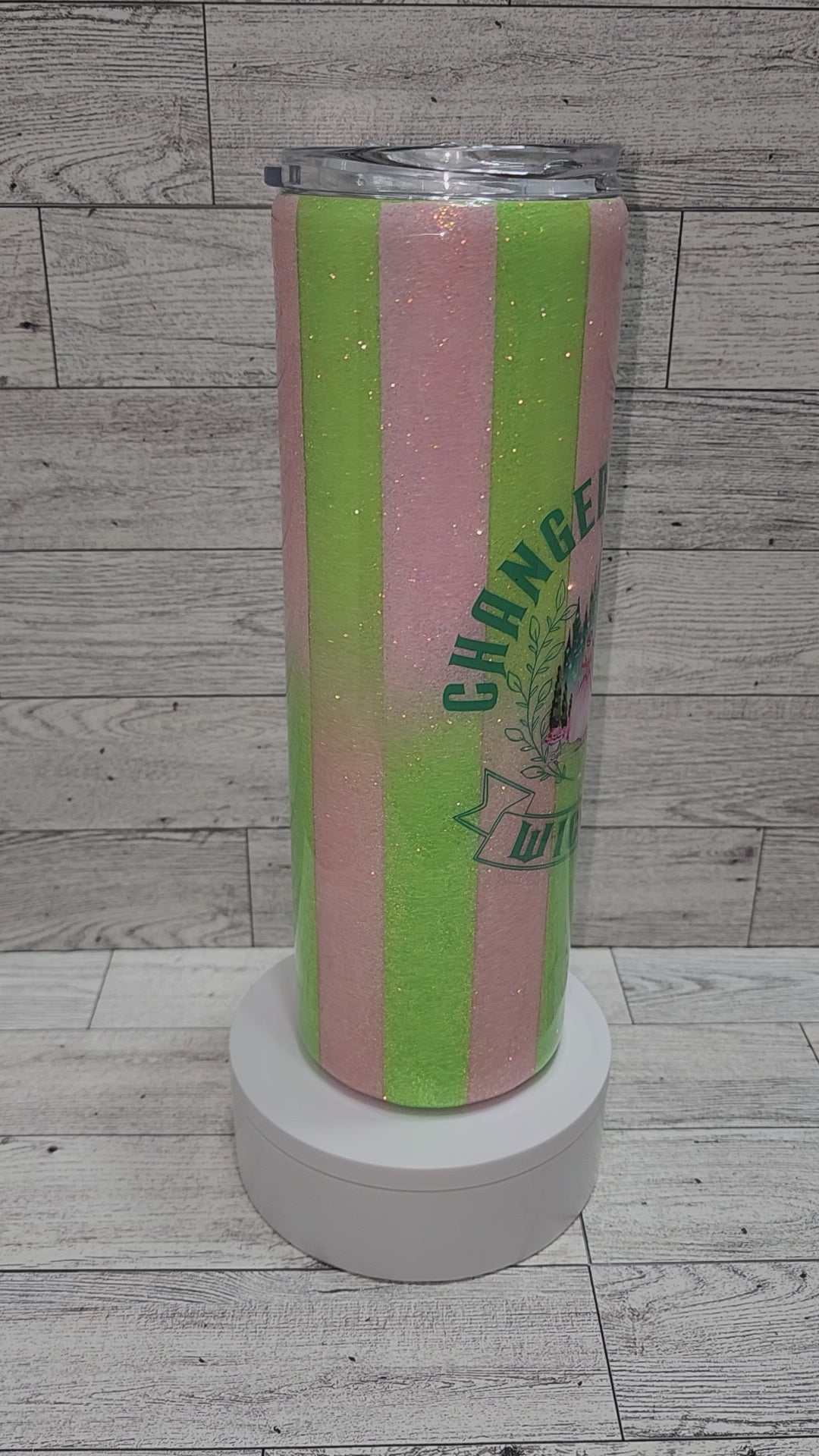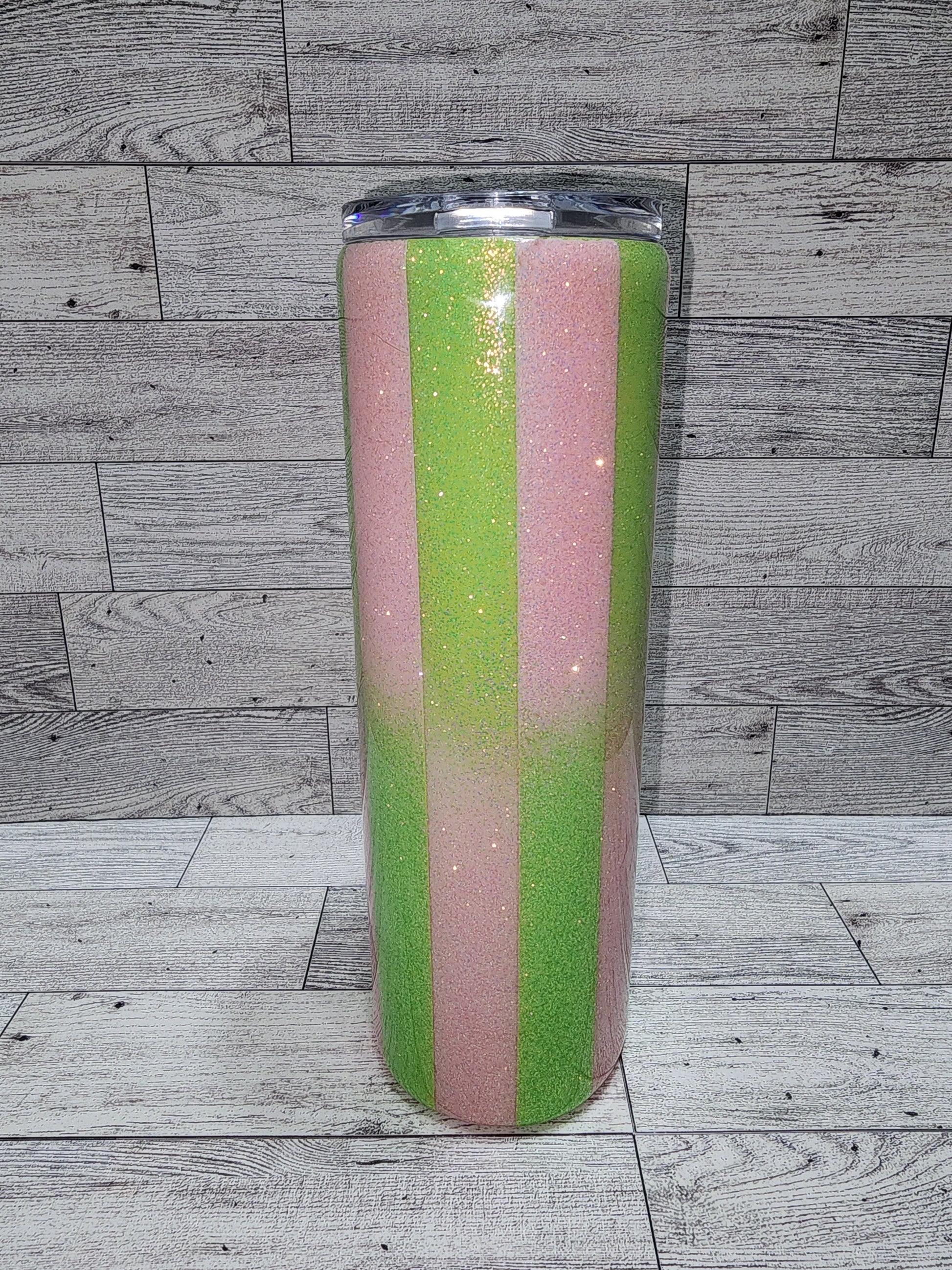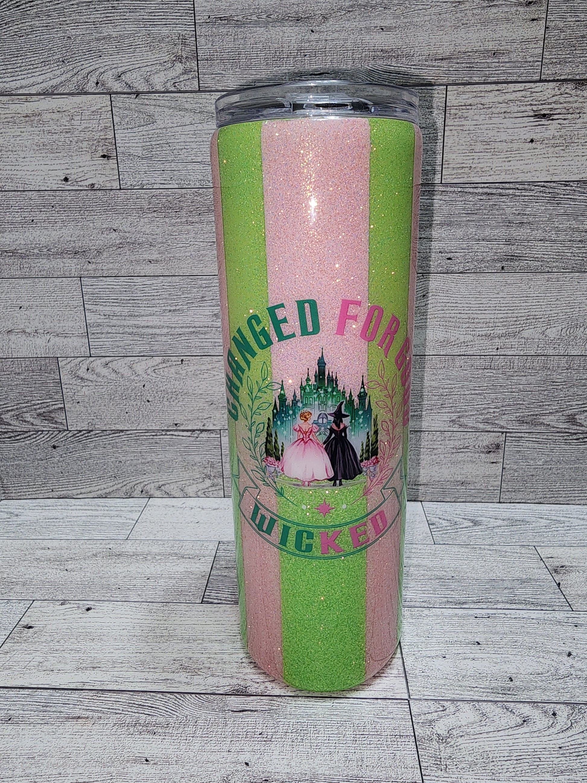 Green and pink reverse double hombre, with Wicked UVDTF and glitter epoxy tumbler. 30oz tumbler comes with a lid and straw.