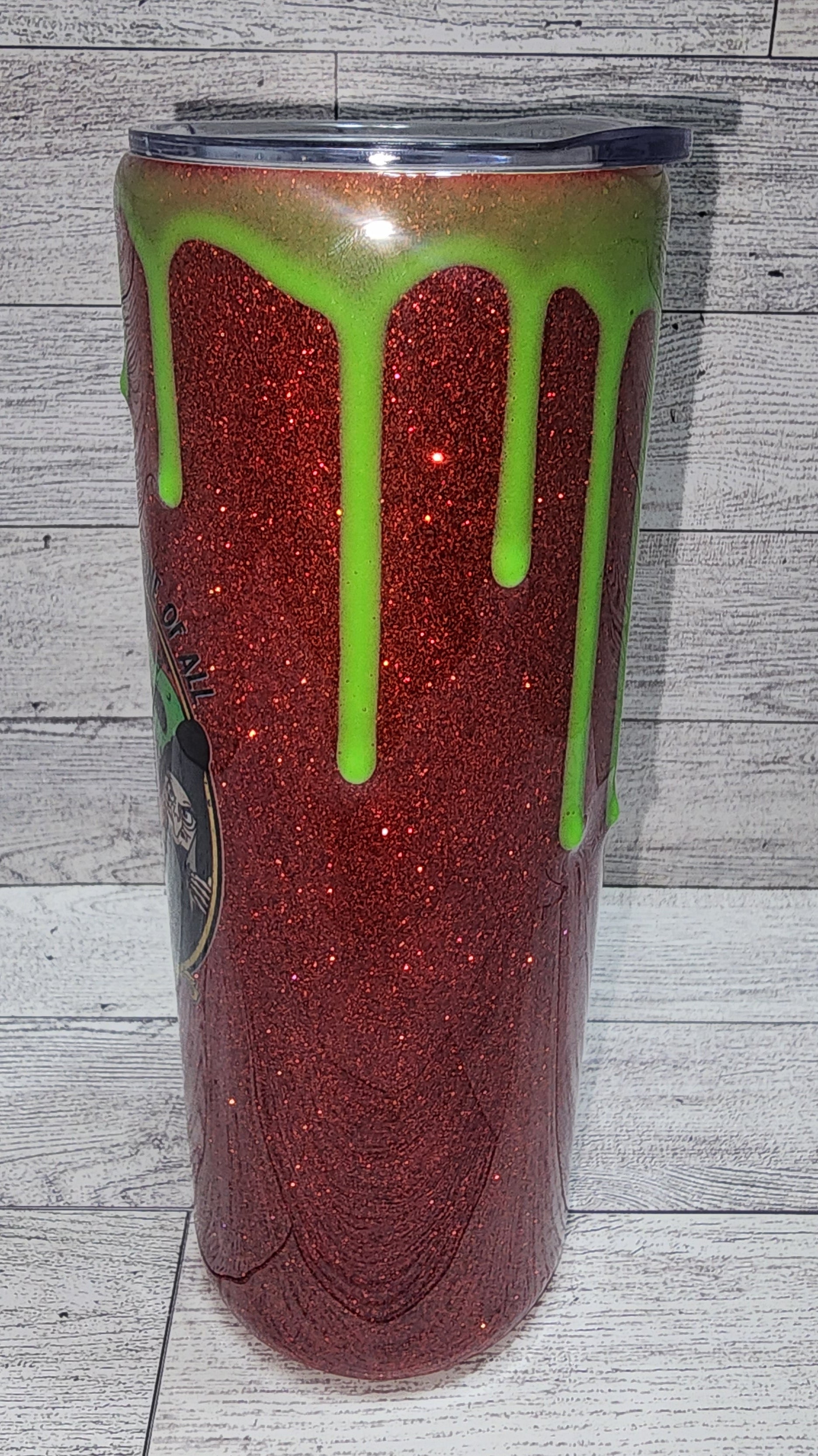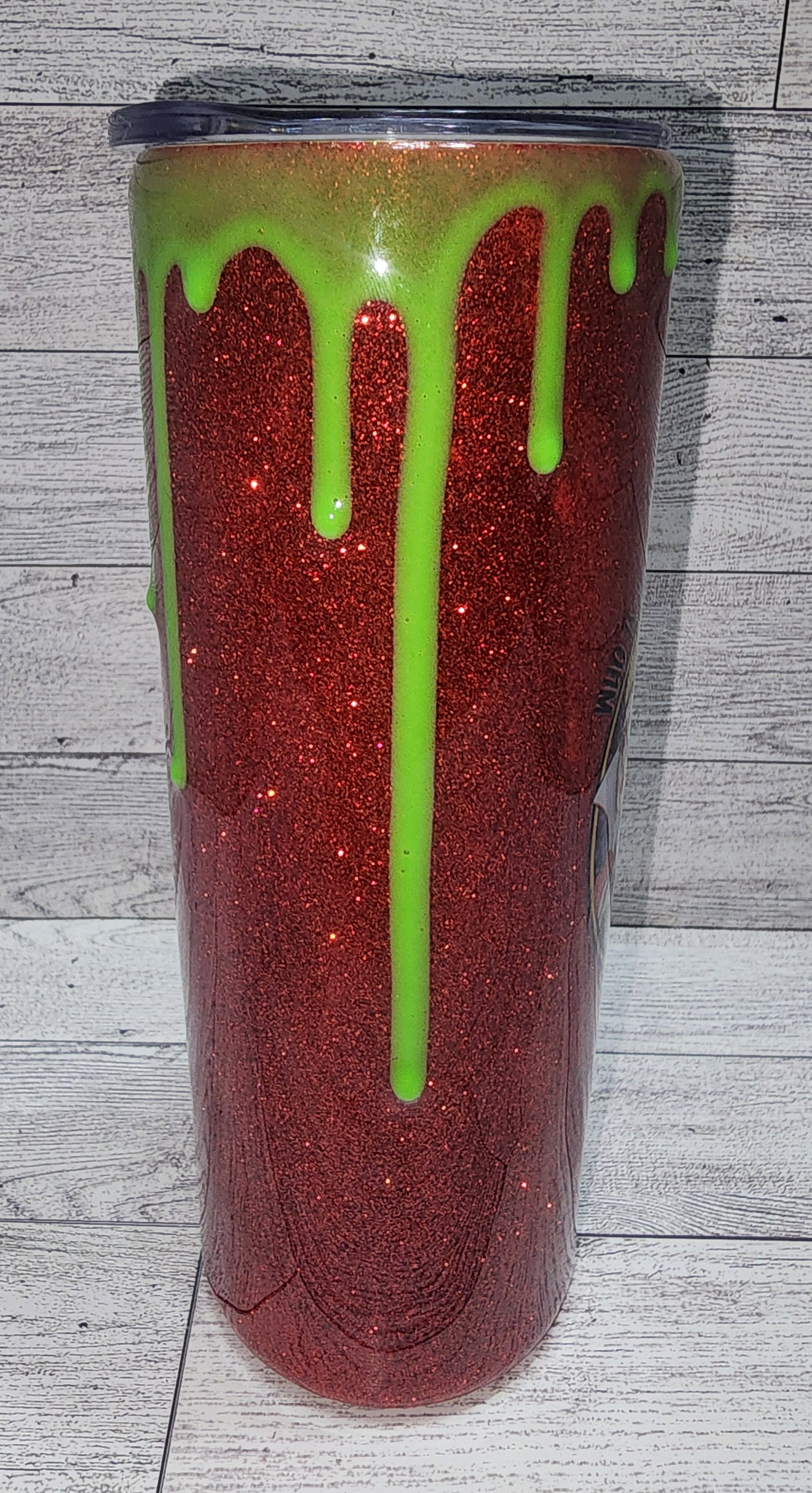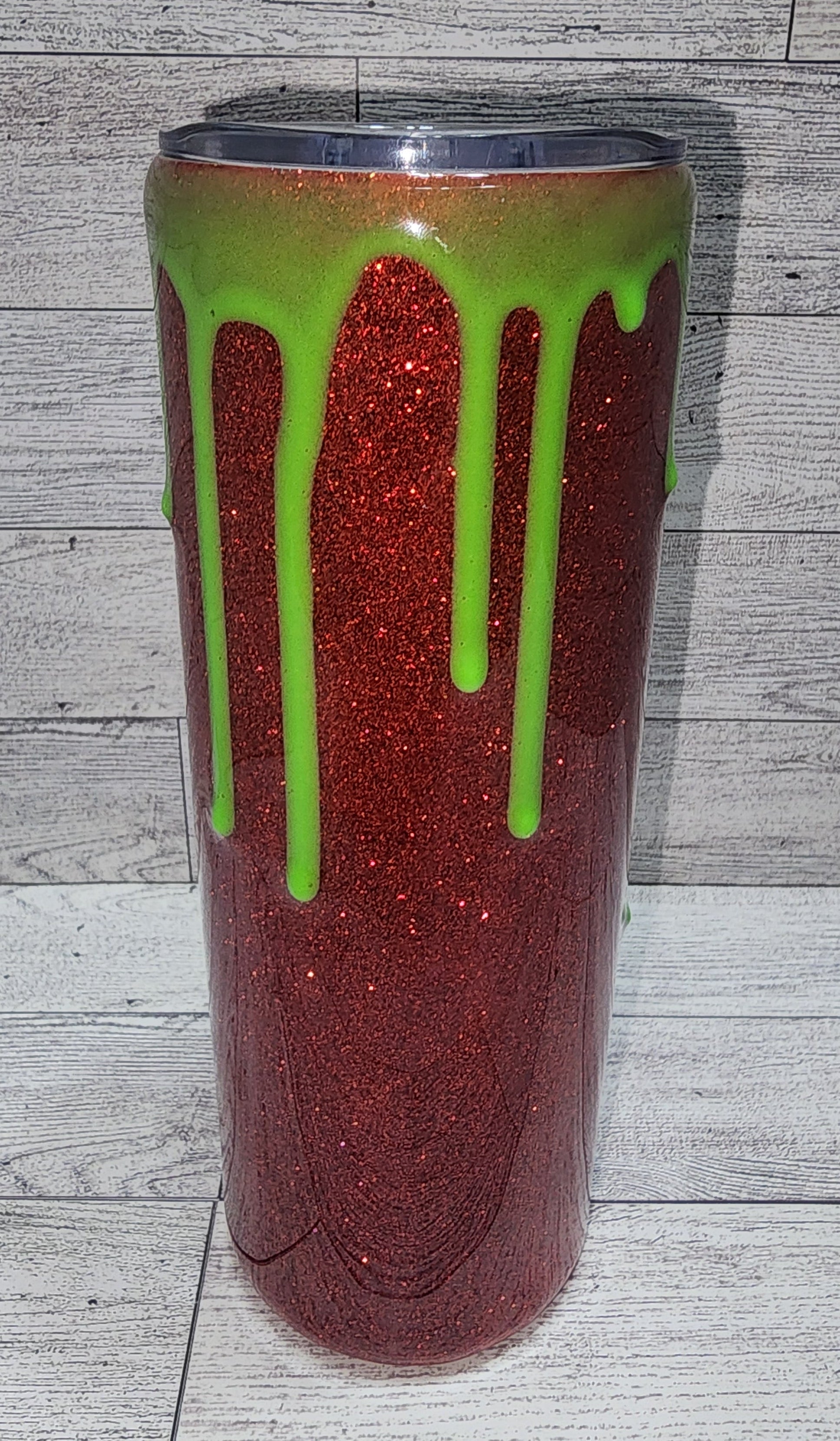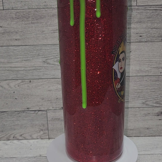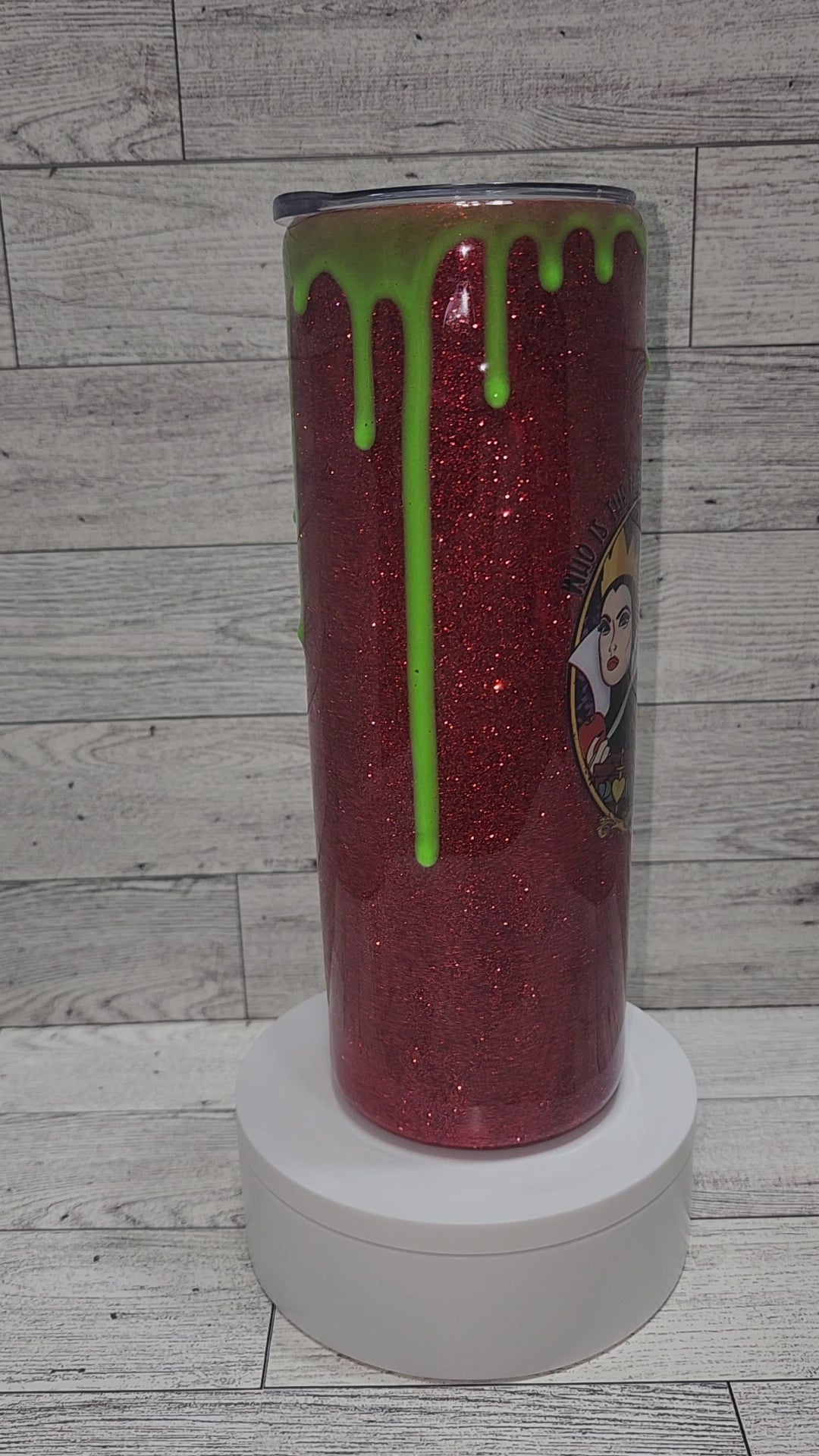 Evil Queen inspired tumbler with red glitter and poison apple green drip. Double wall insulated 20oz stainless steel tumbler. Comes with a lid and a straw.