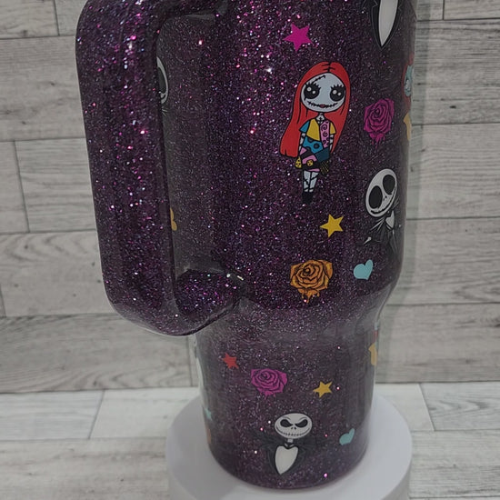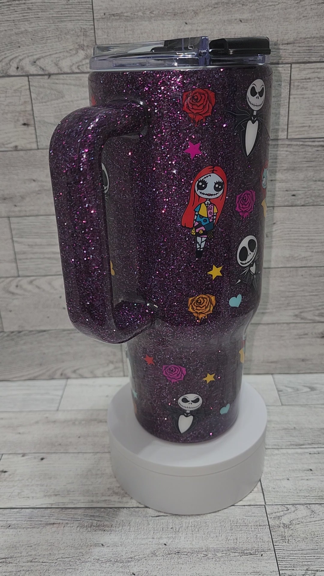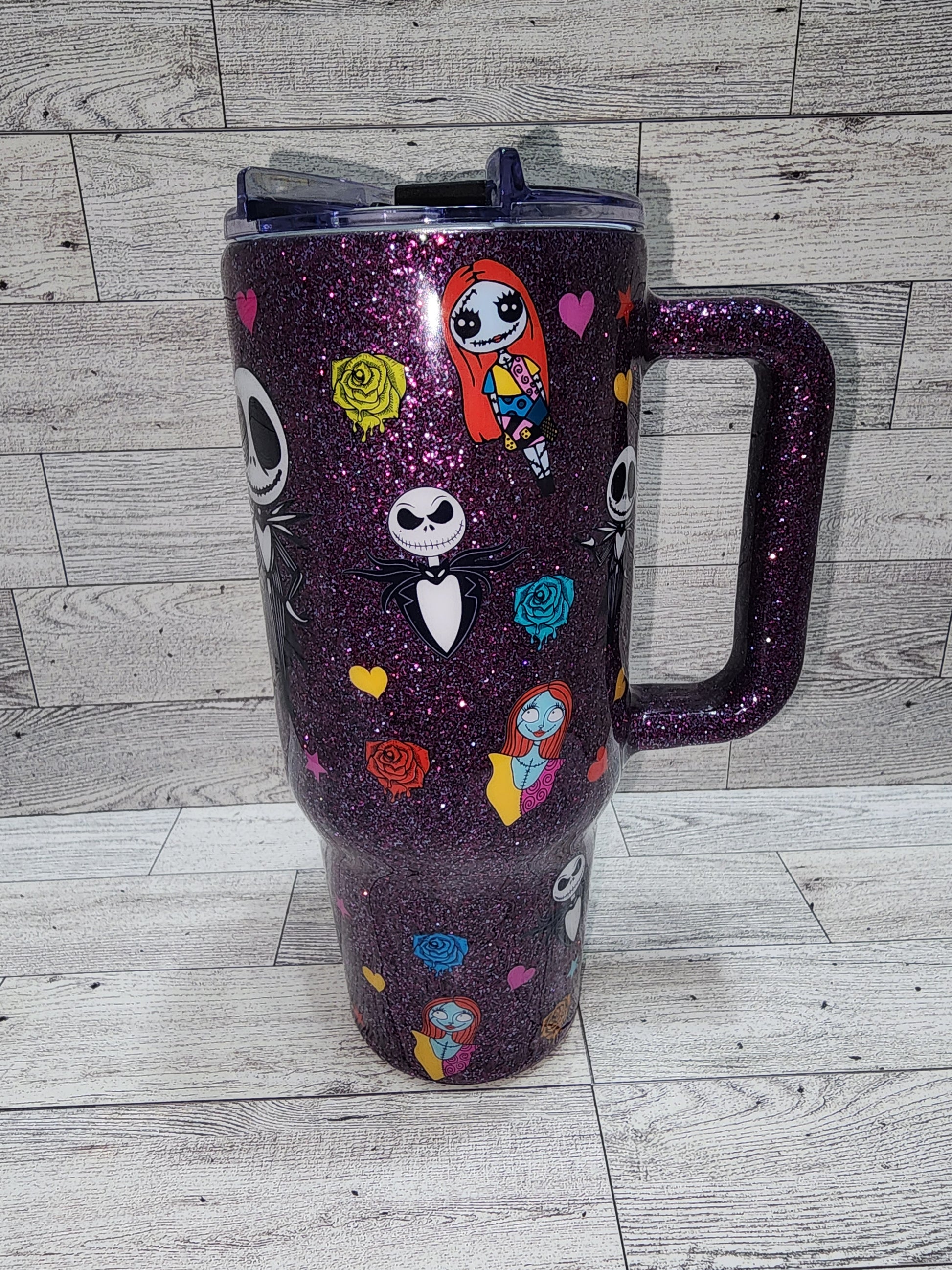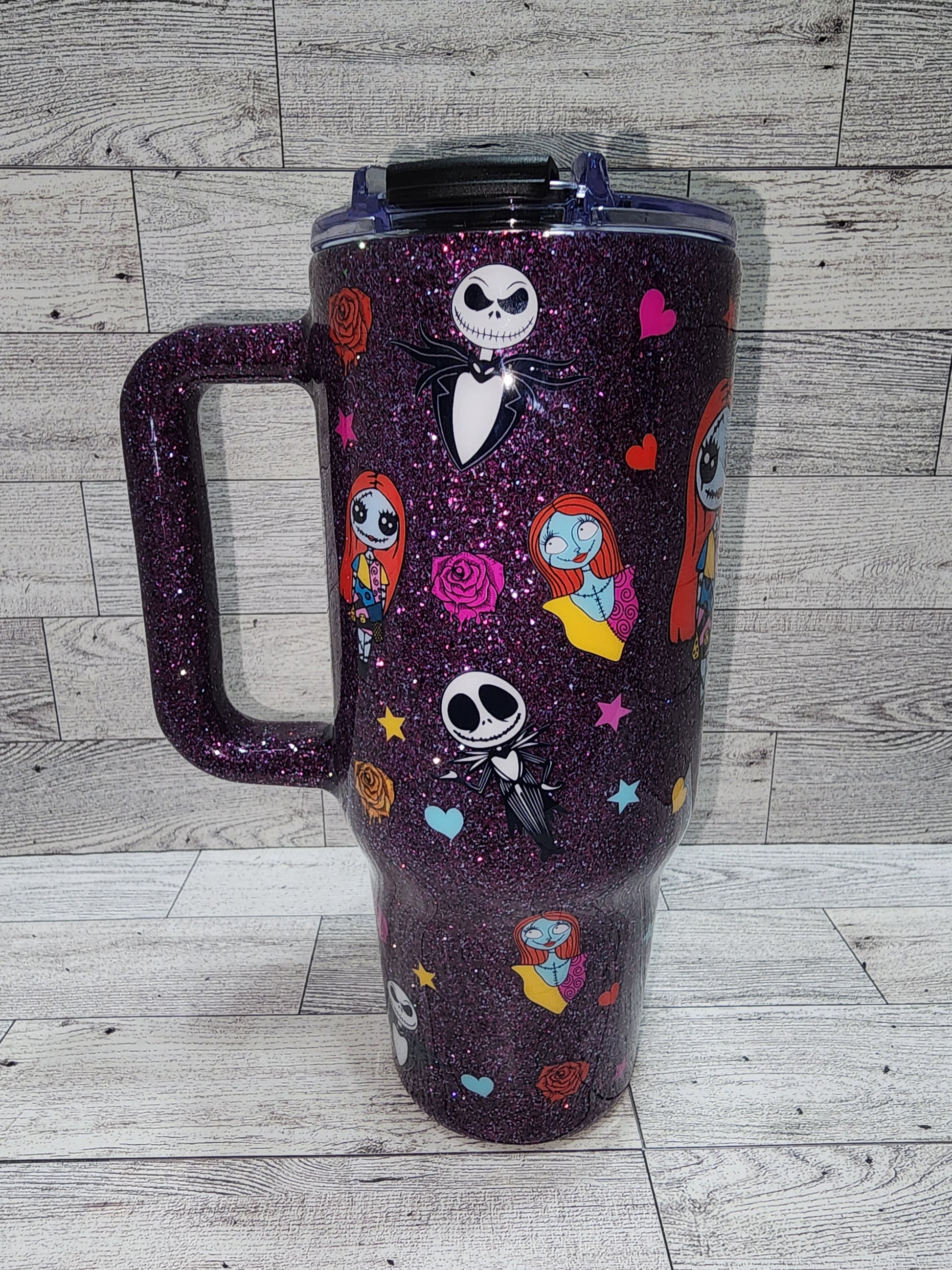 Jack & Sally from Nightmare Before Christmas UVDTF with glitter 40oz epoxy tumbler. Comes with a lid and straw