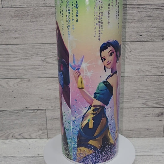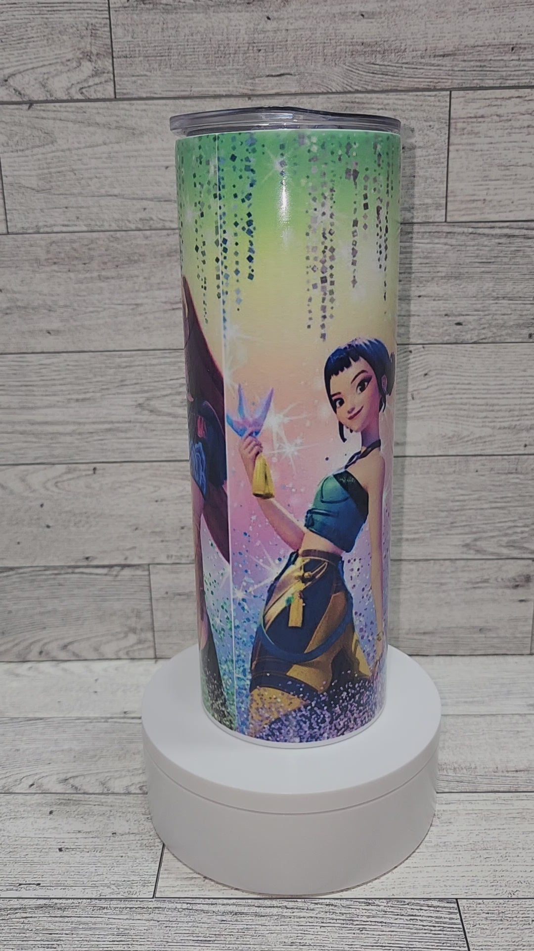 K-Pop Demon Hunters Huntrix inspired 20oz sublimation tumbler. Tumbler is double wall insulated stainless steel and comes with a lid and straw.
