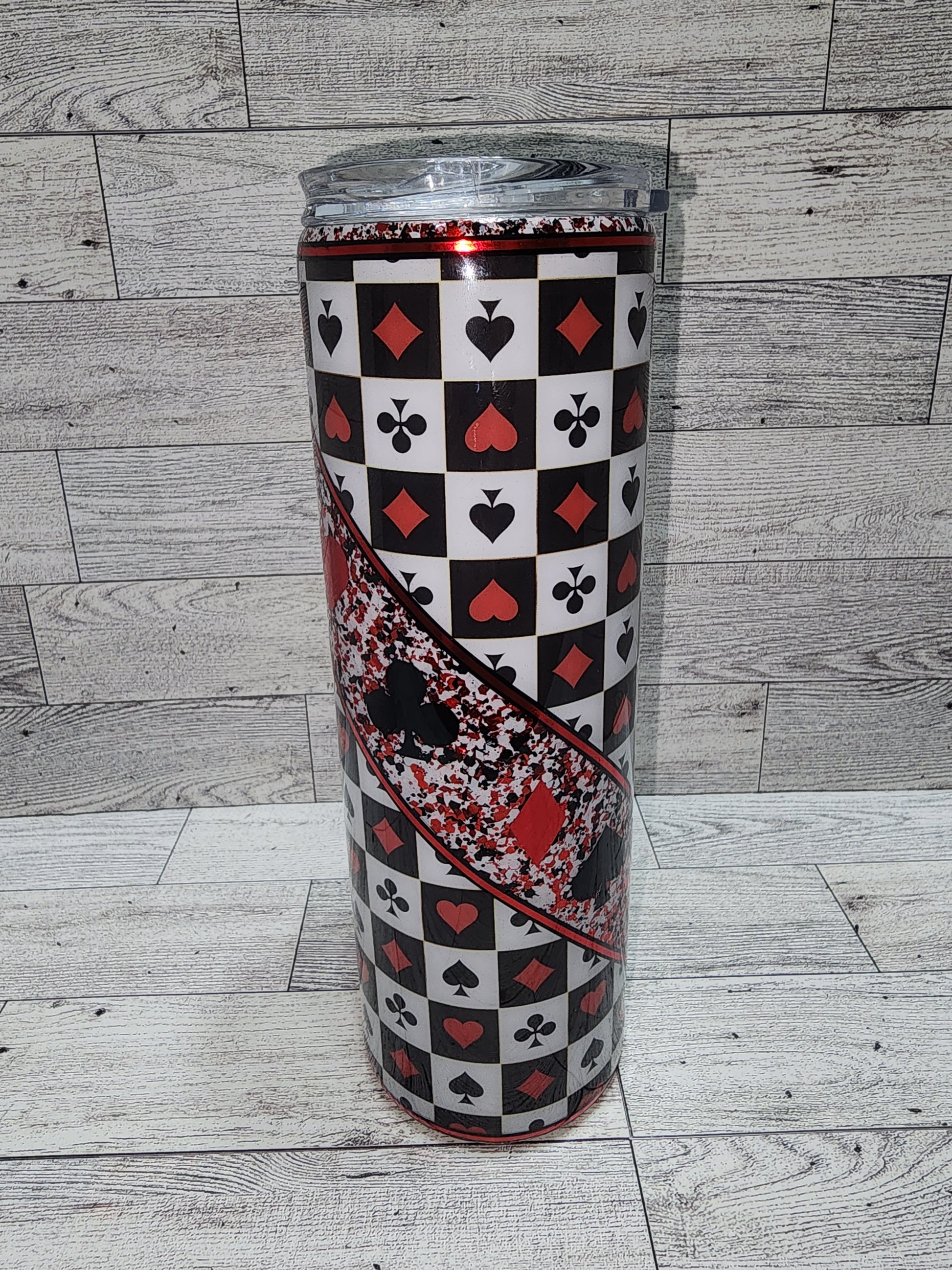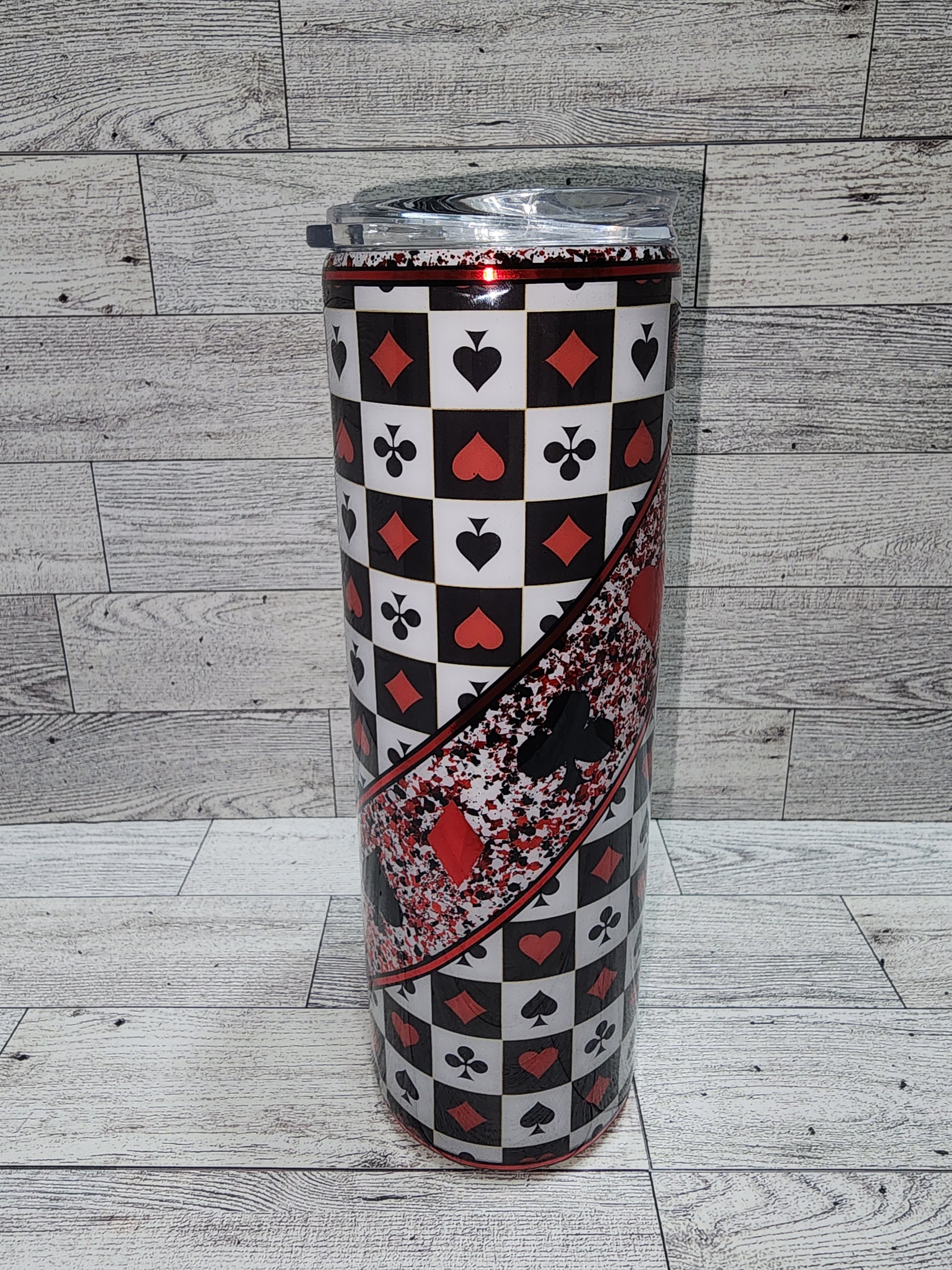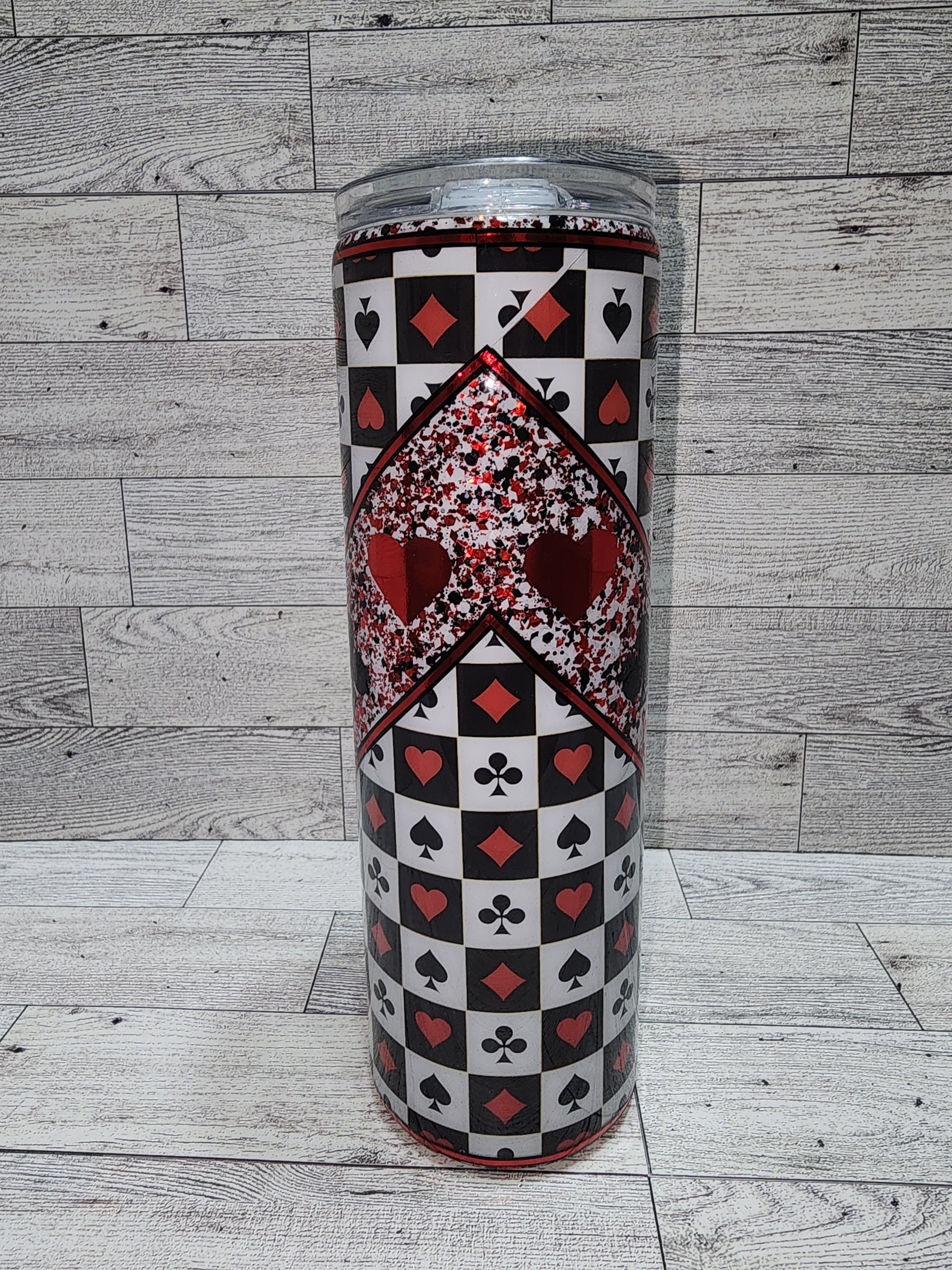 Lady luck V-split vinyl playing card suits and striping, with Lady Luck glitter, epoxy tumbler. 30oz tumbler comes with a lid and straw.