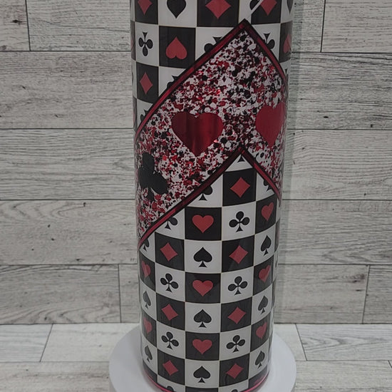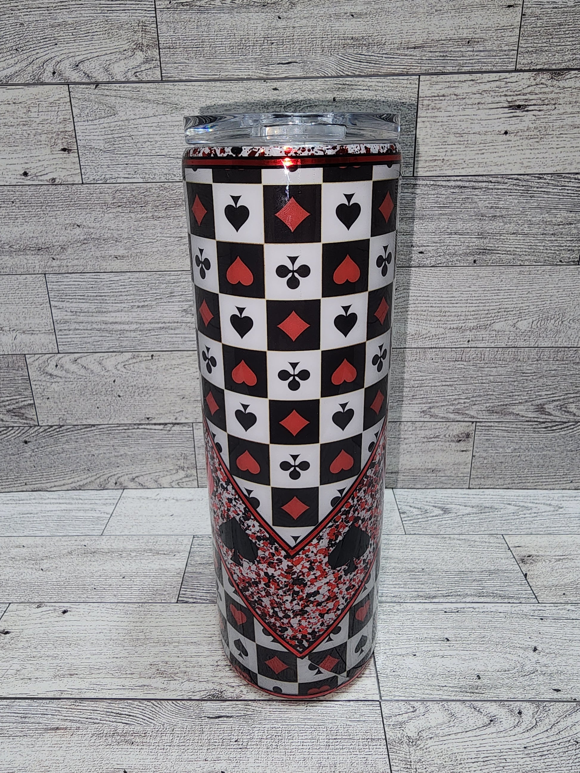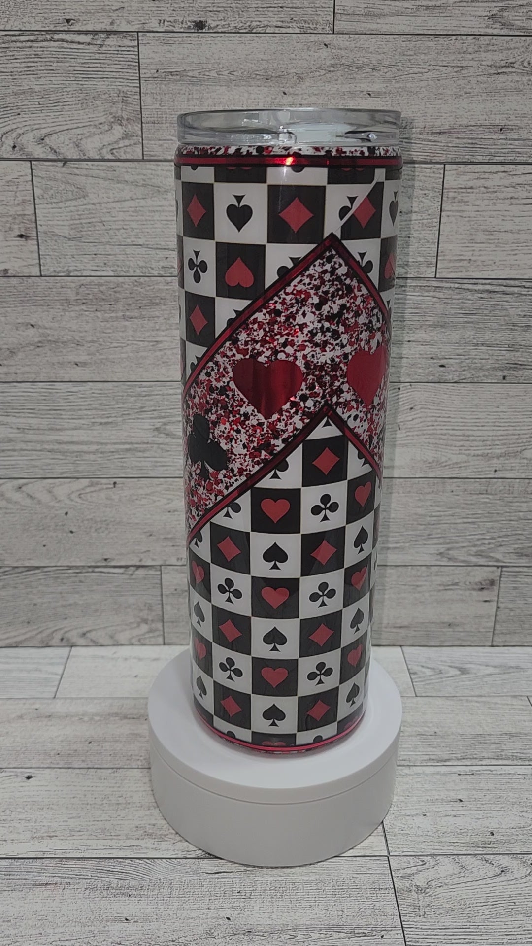 Lady luck V-split vinyl playing card suits and striping, with Lady Luck glitter, epoxy tumbler. 30oz tumbler comes with a lid and straw.
