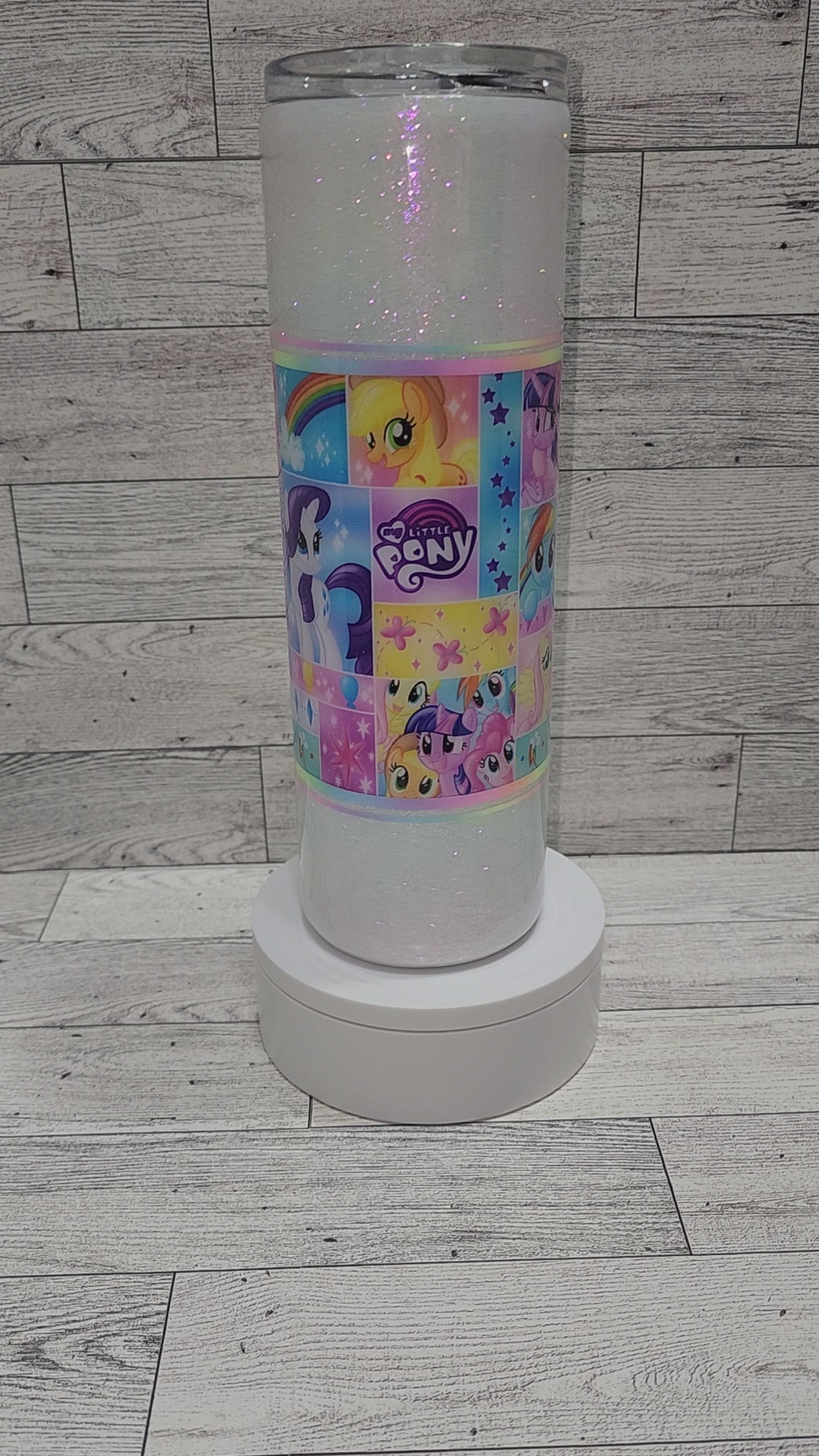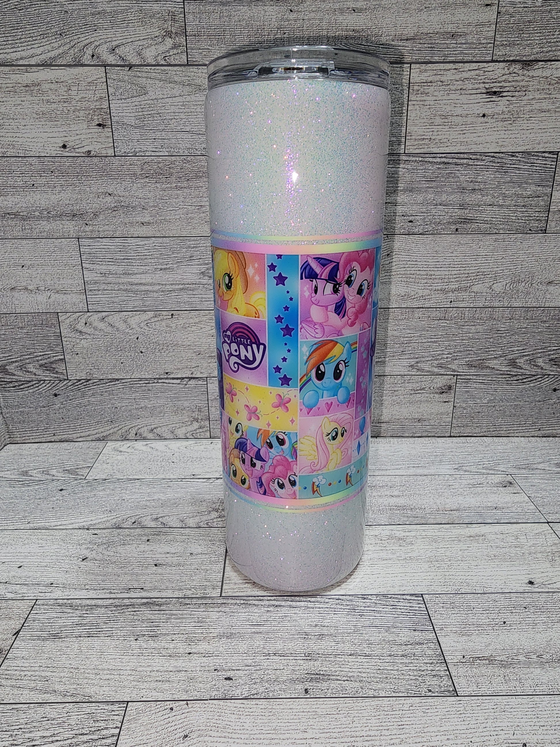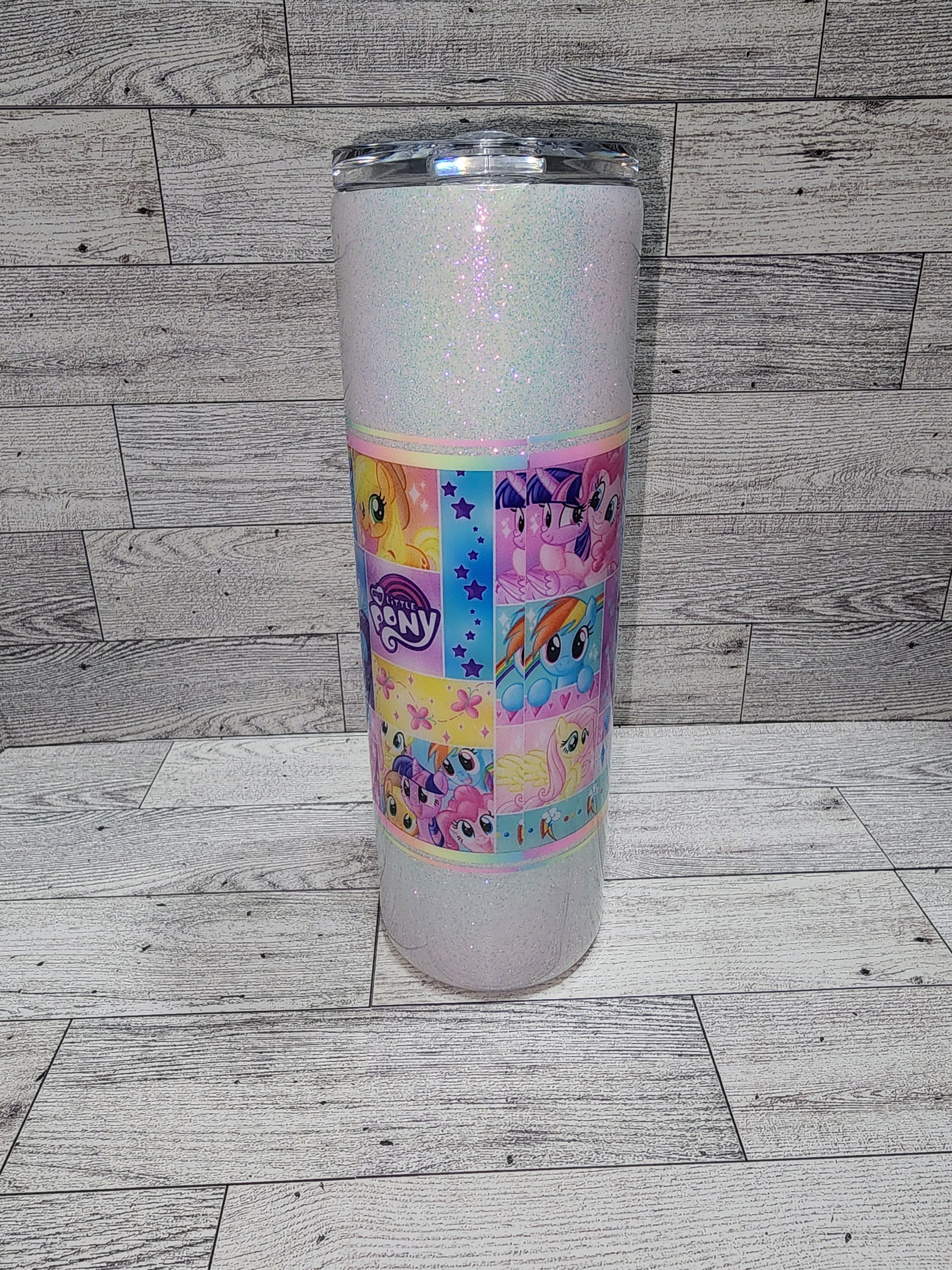 My Little Pony vinyl mid wrap glitter epoxy tumbler with striping. 30oz tumbler comes with a lid and straw.