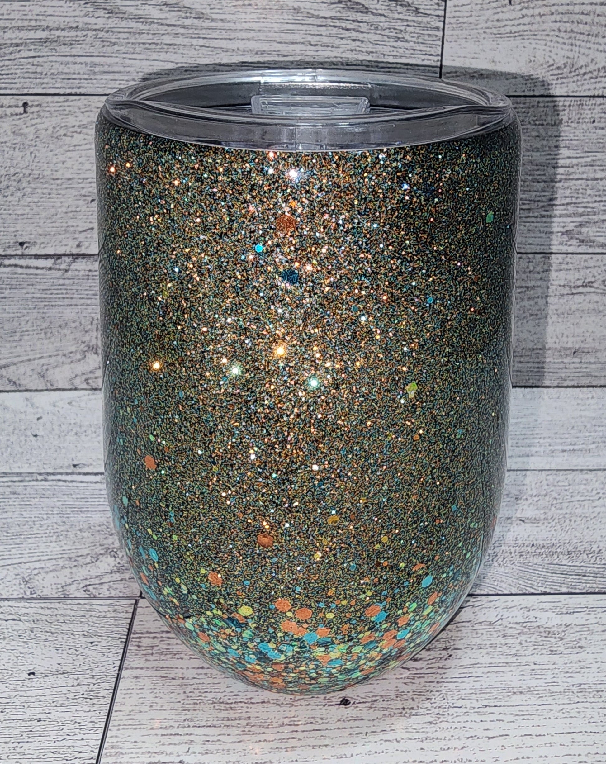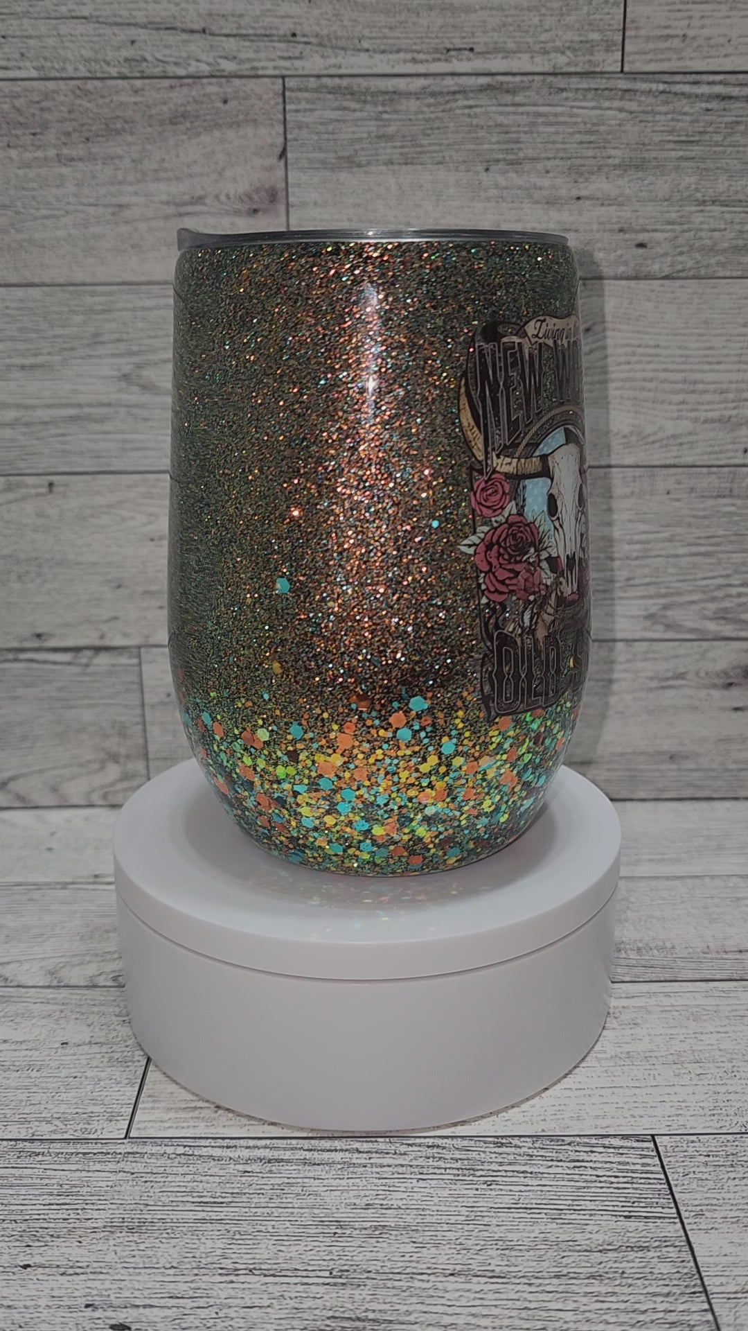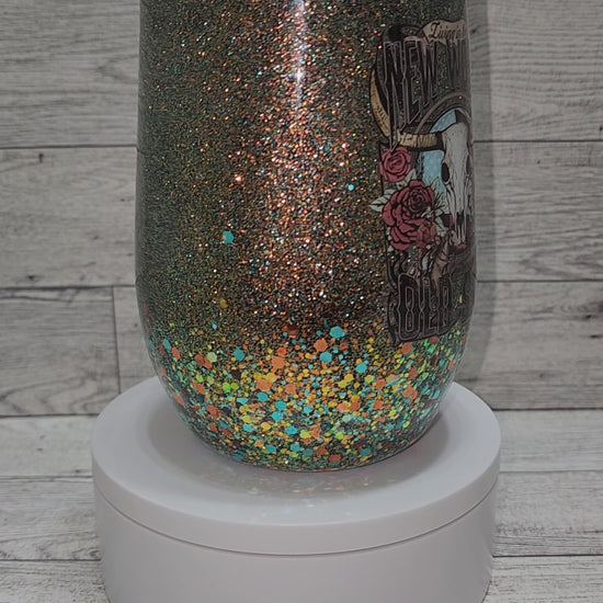 New World Old Soul western UVDTF decal with a western themed ombre glitter 15 oz epoxy wine tumbler. Comes with a lid and a straw. Double wall insulated stainless steel