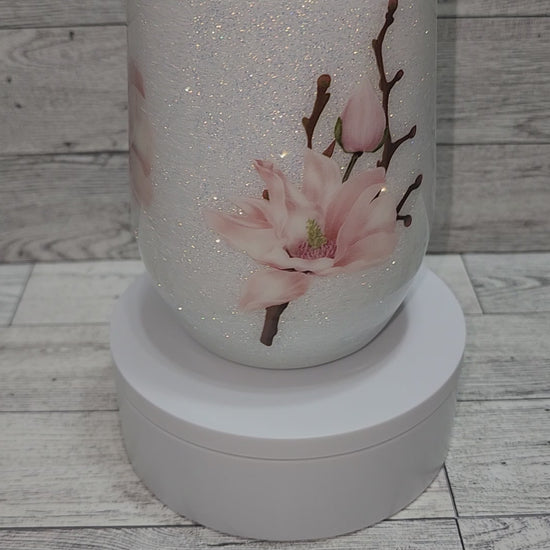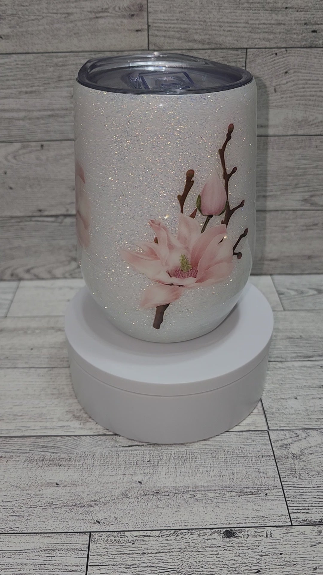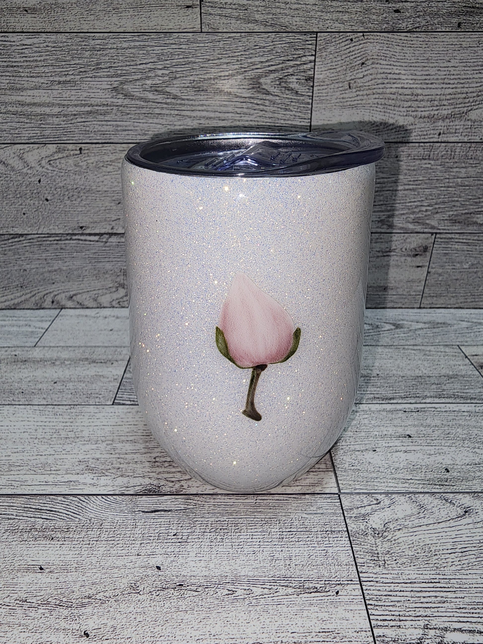 Pink floral UVDTF with glitter 15 oz epoxy wine tumbler. Comes with a lid and a straw. Double wall insulated stainless steel