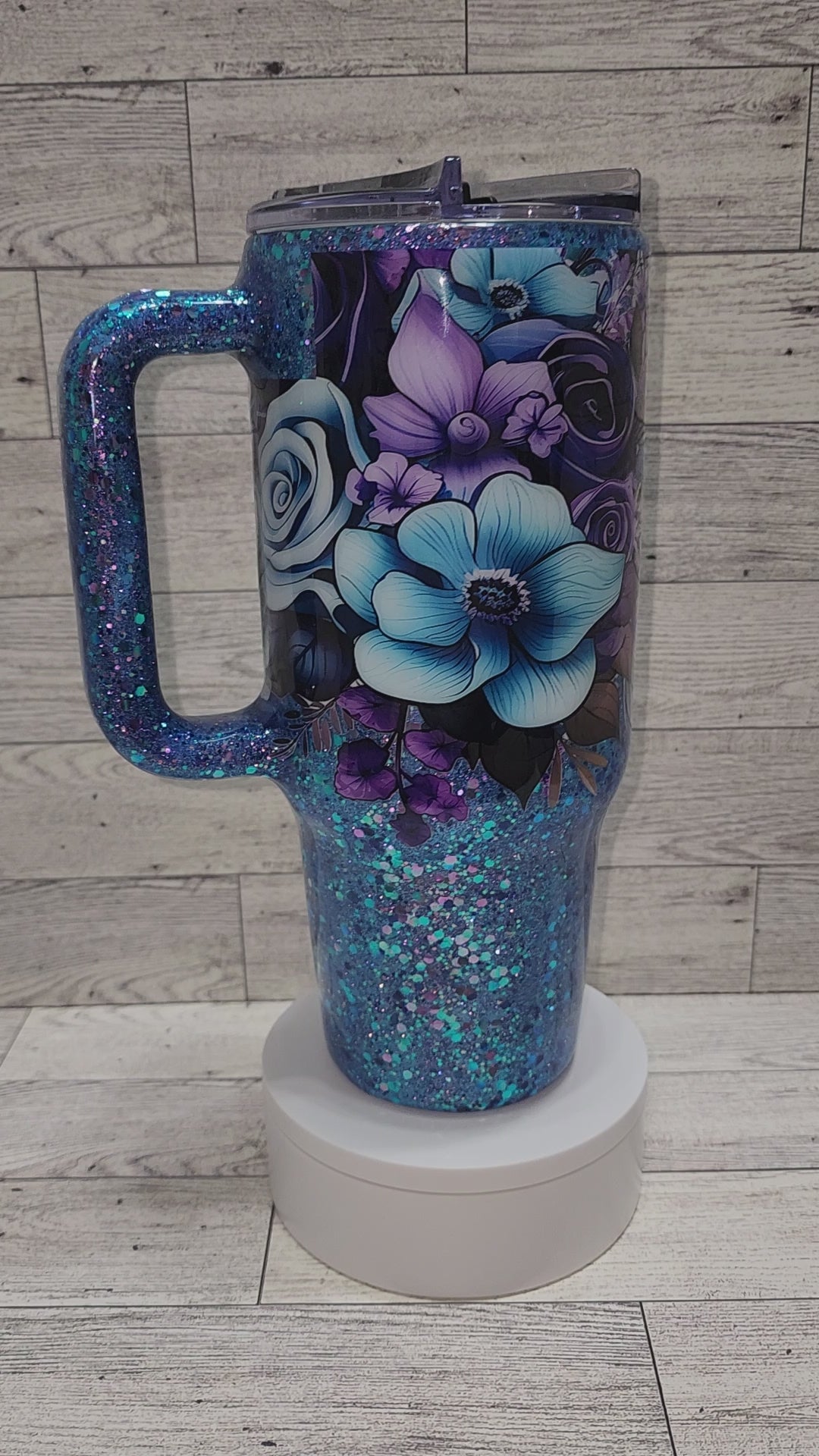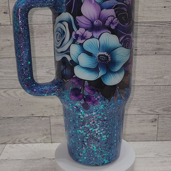 Purple and blue floral UVDTF with blue purple color shift glitter. 40oz epoxy tumbler. Comes with a lid and a straw