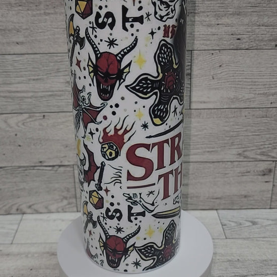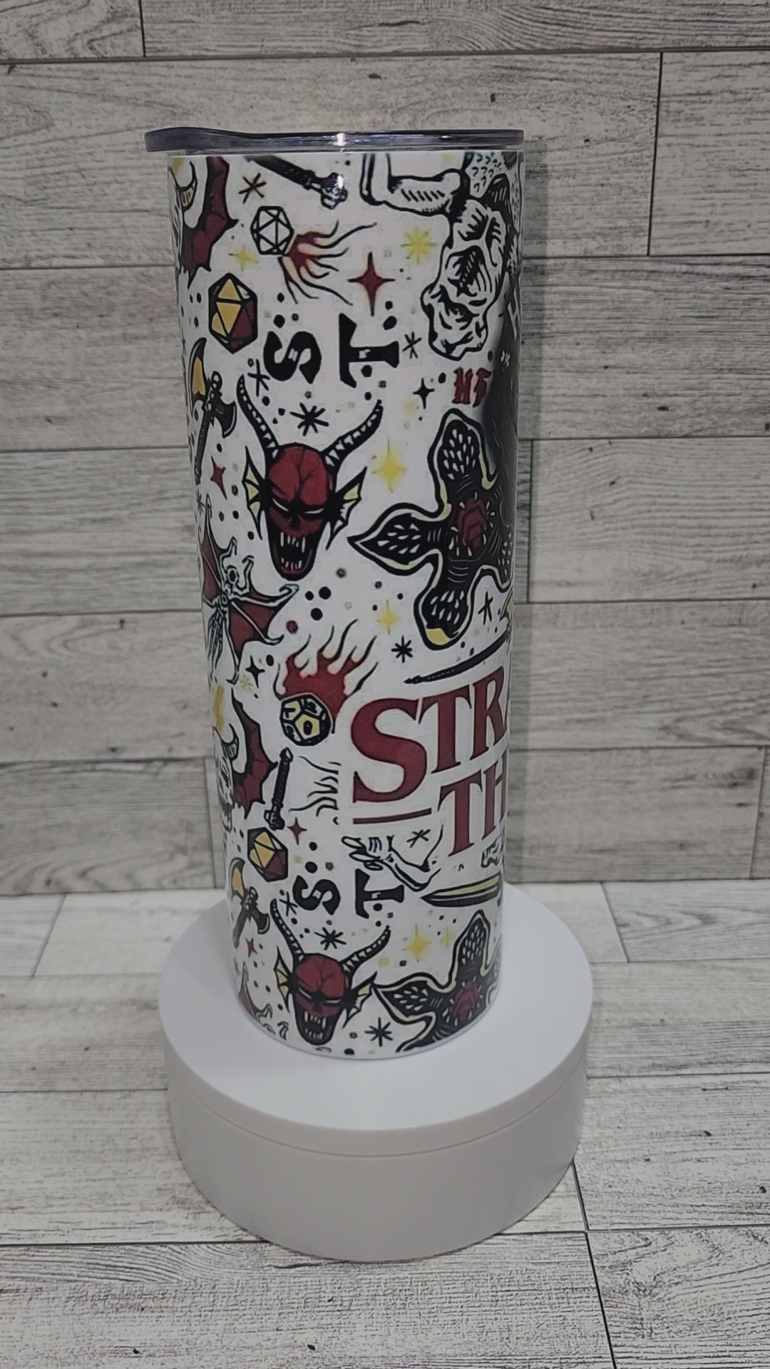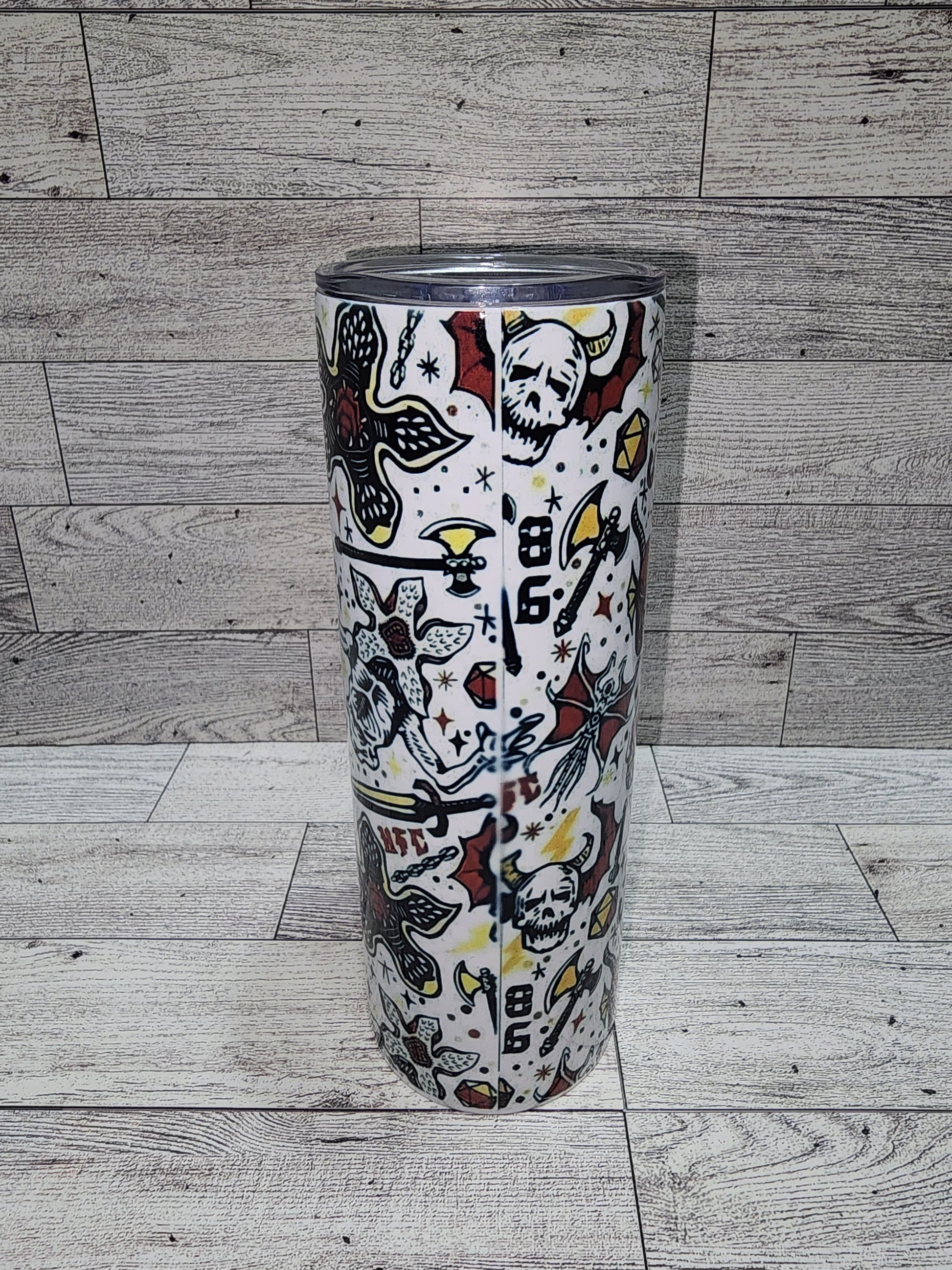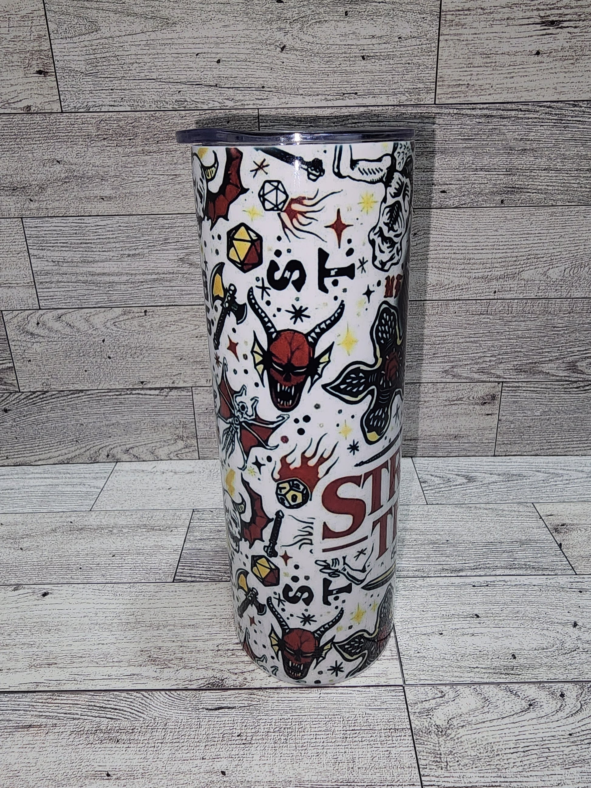 20oz sublimation tumbler with a Stranger Things design. Comes with a lid and straw. Double wall vacuum insulated cup design.