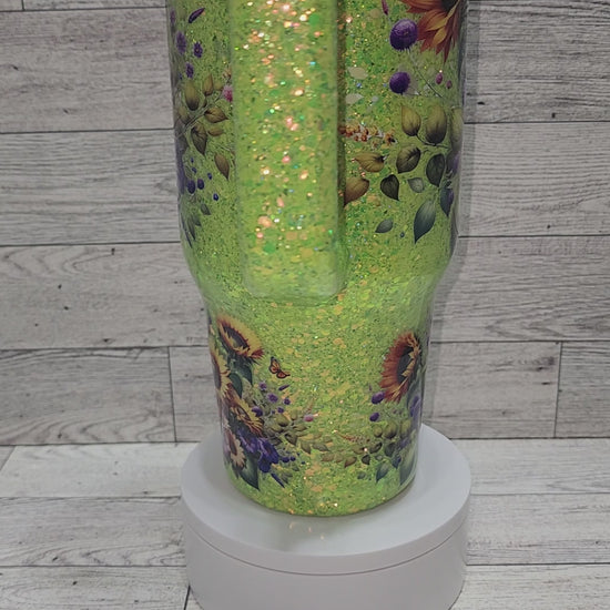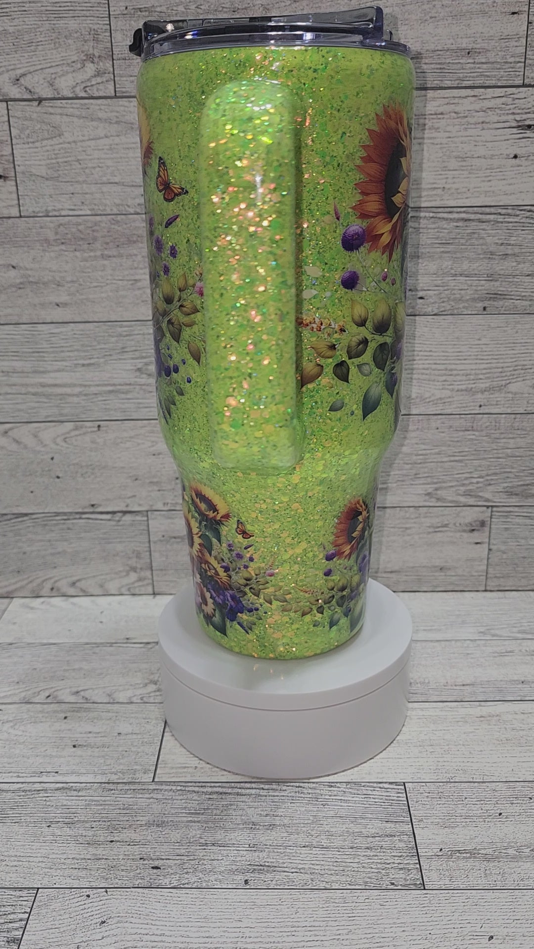 Sunflower Fairy UVDTF with light green color shift glitter. 40oz epoxy tumbler. Comes with a lid and a straw