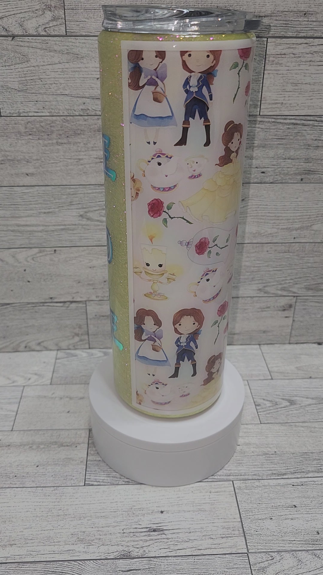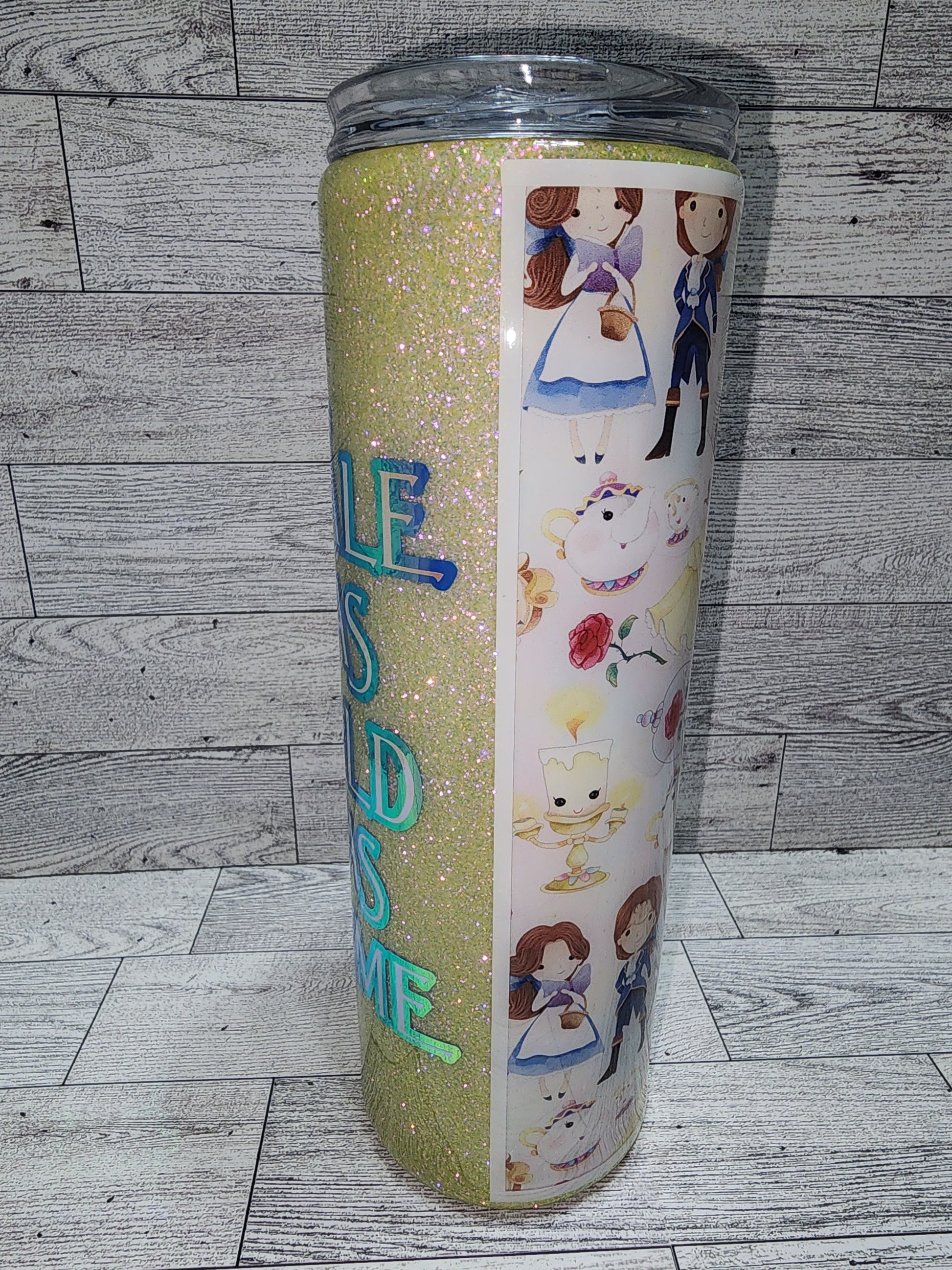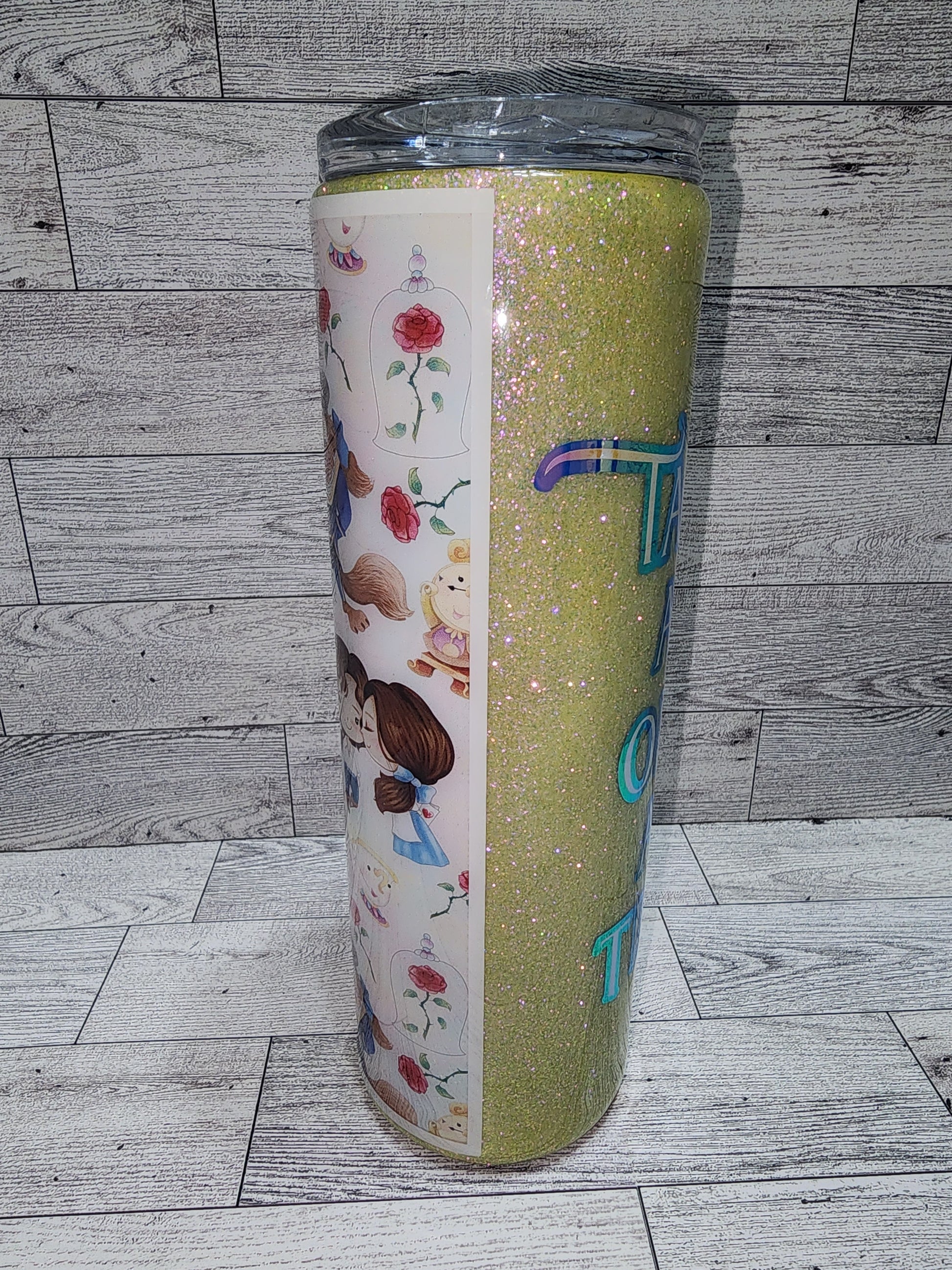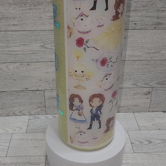 This 30oz tumbler is Beauty and the Beast inspired. It has cute cartoon character vinyl with pale yellow glitter and Tale as Old as Time in complimenting color shift vinyl. This tumbler is stainless steel, double wall insulated and comes with a lid and straw.