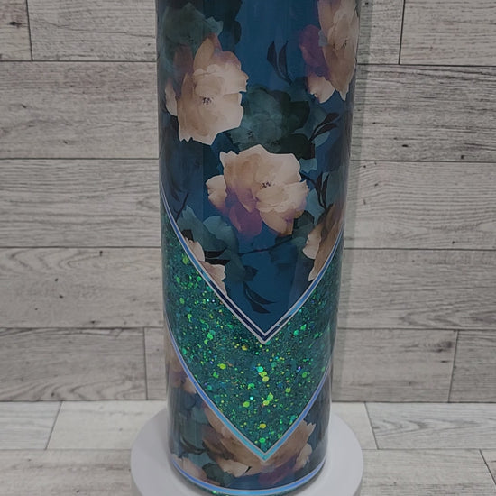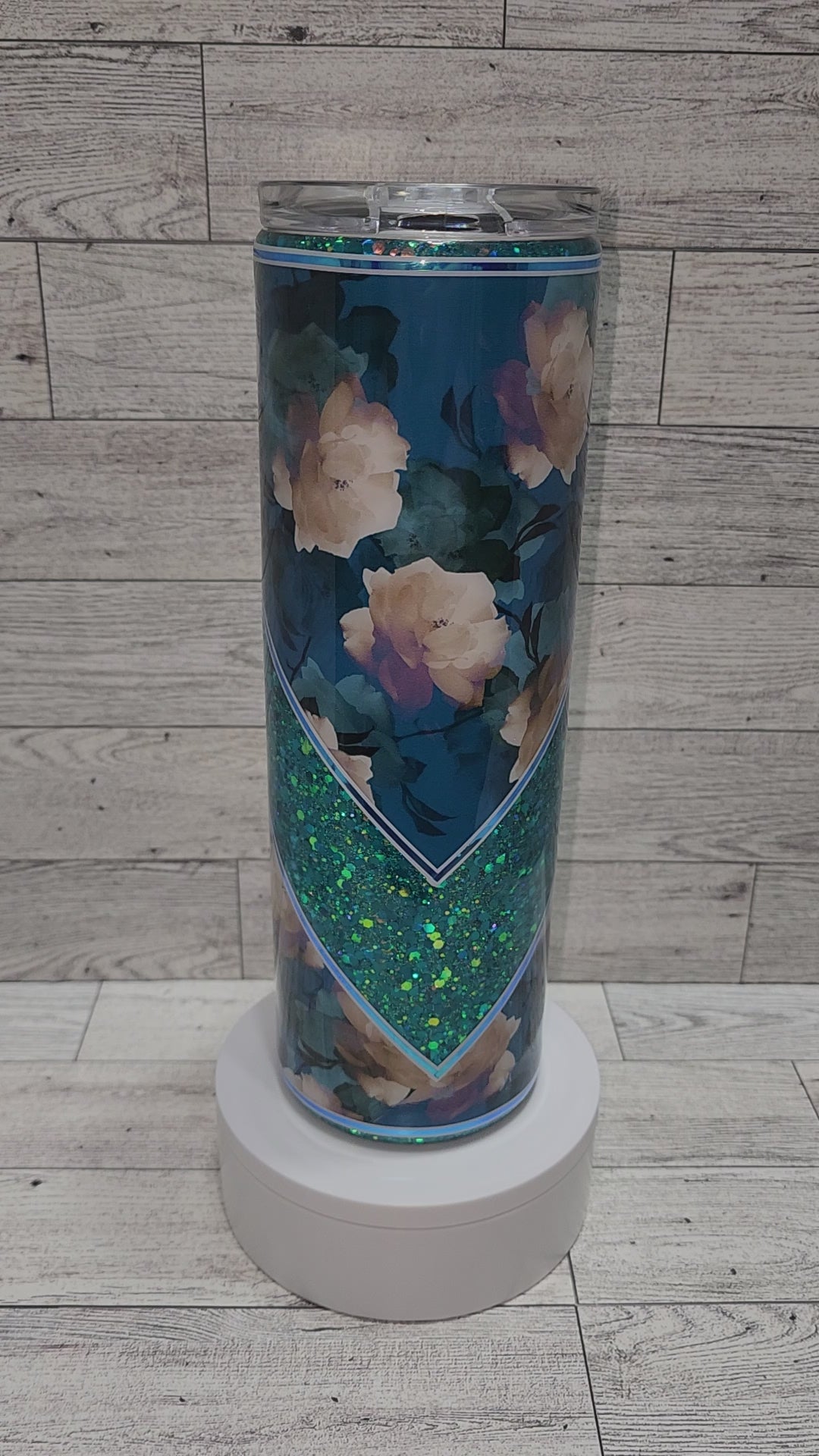 Teal with white flowers v split glitter epoxy tumbler. 30oz tumbler comes with a lid and straw.