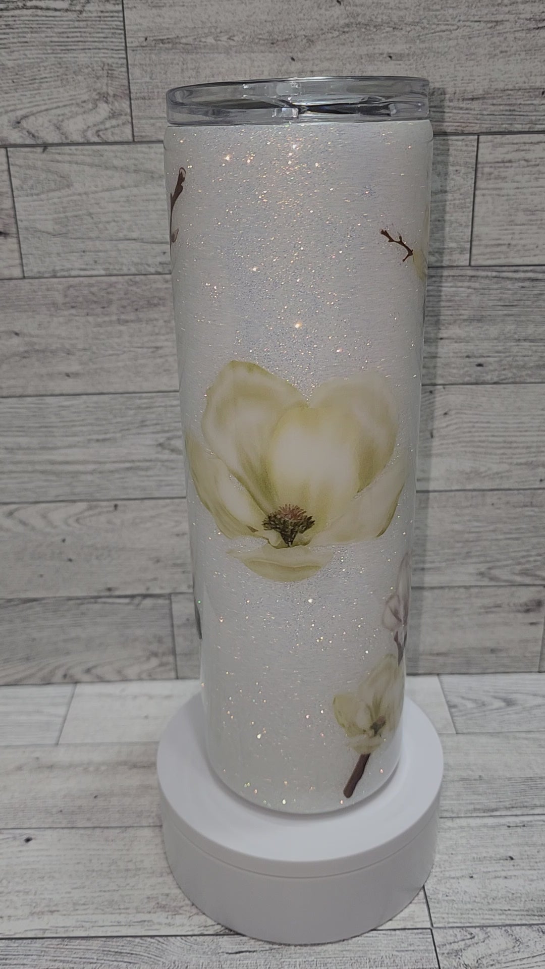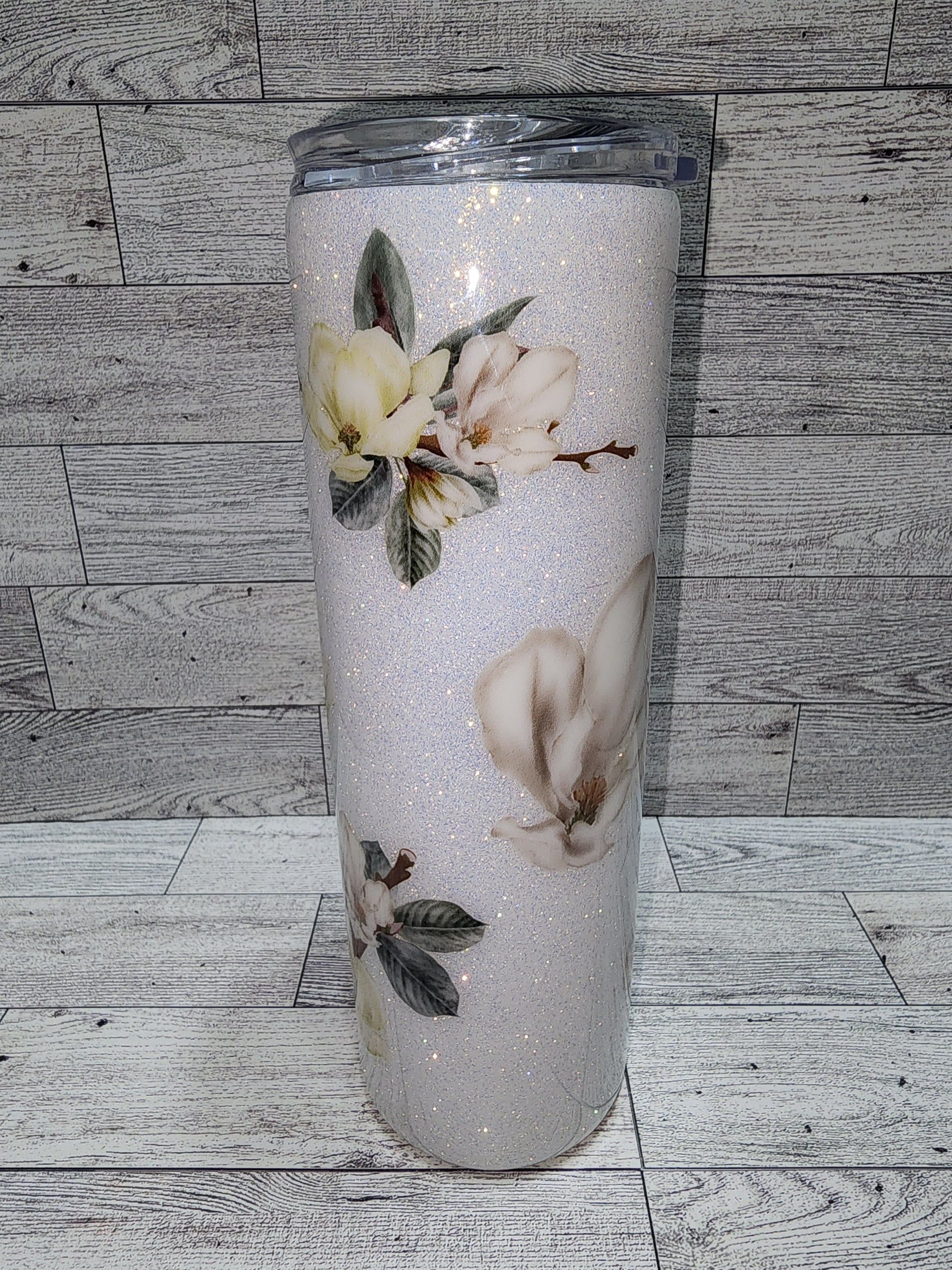 White flower UVDTF with glitter, epoxy tumbler. 30oz tumbler comes with a lid and straw.